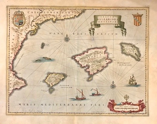 Carta geografica originale (cm. 50,5x39 più ampi margini bianchi) tratta dall’edizione in lingua latina dell’ ‘Atlas novus, sive descriptio geographica orbis terrarum’ pubblicato da Johannes Janssonius ed Henricus Hondius. Splendida coloritura d’epoca all’acquarello. Minuscola abrasione di cm. 0,5 ca. nella parte incisa, peraltro esemplare in ottimo stato di conservazione. Rara.