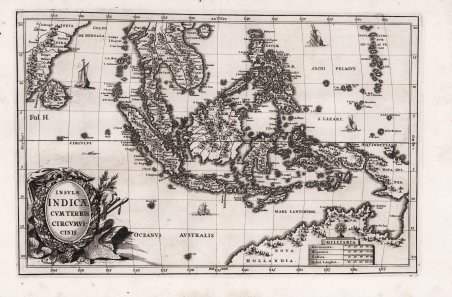 Affascinate carta del Sudest asiatico che mostra la Malesia, la Tailandia, il Vietnam, Singapore, Indonesia. ' In basso a destra, è rappresentata anche l'Australia, la Nova Hollandia, con colline e foreste lungo le coste. Decorativa carta geografica pubblicata nell'opera di Heinrich Scherer ' Atlas Novus exhibens orbem terraguem per naturae opera, historiae navae acveterus monumenta, artistique geographicae leges et praecepta ' edita in 8 parti, stampate tra il 1702 e il 1710 a Monaco di Baviera. Heinrich Scherer, professore di matematica a Monaco di Baviera, era un gesuita devoto la cui opera sottolineava la gerarchia cattolica e la diffusione delle missioni gesuite in tutto il mondo. Il suo ' Atlas Novus ' contiene mappe di tutte le altre parti che mostravano la diffusione del cattolicesimo e delle missioni gesuite. Le 180 mappe incluse in questo lavoro sono state preparate tra il 1699 e il 1700 e sono state incise da Leonard Hecknaeur, Joseph Montelegre e Matthus Wolfgang; ogni volume è introdotto da splendidi frontespizi allegorici dagli stessi incisori. Incisione su rame, in ottimo stato di conservazione. Fascinating map of Southeast Asia. Includes today's Malaysia, Thailand, Vietnam, Singapore, Indonesia, Ceylon.Nova Hollandia (Australia) is depicted at bottom right with hills and forests along the coasts. Nova Guinea is almost attached to Nova Hollandia. The coastline shows Van Arnham's Land, Van Der Lin, C. Diemen and C. Van Diemen's Land. Decorative map by Heinrich Scherer for his ' Atlas Novus exhibens orbem terraguem per naturae opera, historiae navae acveterus monumenta, artistique geographicae leges et praecepta.published in eight volumes from 1702-1710 in Munich. Scherer, a devout Jesuit, produced this geographical compendium to depict the Catholic hierarchy and the spread of Jesuit missions throughout the world. The 180 maps included in this work were prepared between 1699 and 1700 and were engraved by Leonard Hecknaeur, Joseph Montelegre or Matthus Wolfgang with each volume introduced by fine allegorical frontispieces by the same engravers. Copper engraving, in very good condition. Cfr. Parry, p.163 pl.5.35.Tooley (Australia) #1124.