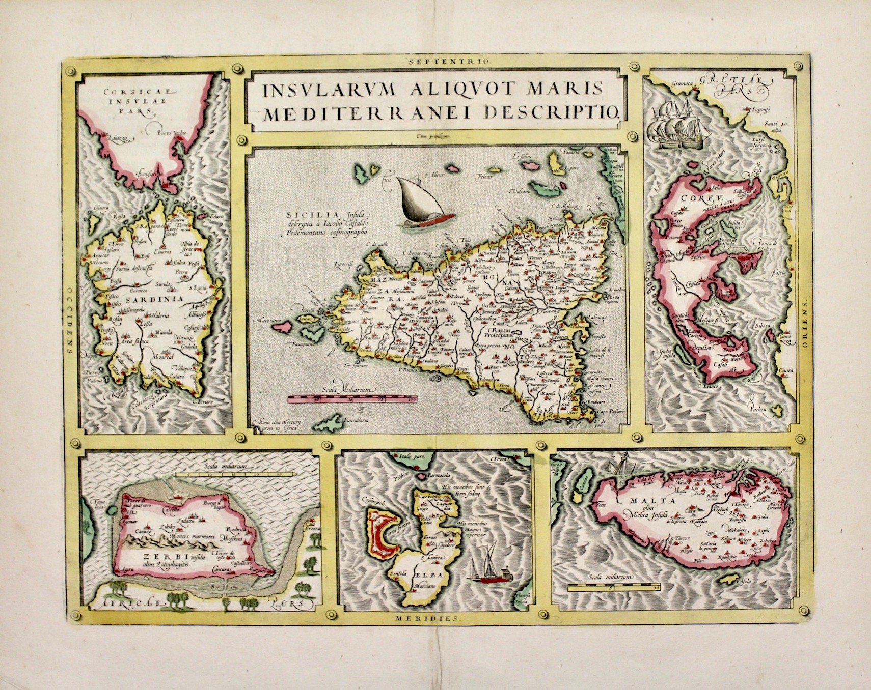 Incisione in rame, mm 359x462, dipinta a mano, tratta da "Theatrum Orbis Terrarum" il primo atlante moderno, comprendente carte di tutte le zone del mondo; la geniale intuizione di Ortels, latinizzato successivamente, fu appunto questa: prima d'allora la produzione cartografica era stata irregolare, locale a livello di produzione ed i pochi atlanti, i cosiddetti "Atlanti Lafreriani" erano costituiti su richiesta raccogliendo carte di alcune zone, ignorando le altre. Ortelius riunì in un unico corpus la produzione cartografica eterogenea del periodo, costituendo la base per un'impresa editoriale di enorme successo, pubblicata dal 1570 al 1612. Ottimo esemplare