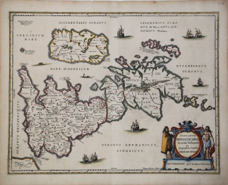 Mappa realizzata da Jansson delle antiche Isole Britanniche, così come si presentavano durante il terzo e il quarto secolo, che include un cartiglio decorativo con il titolo, navi a vela e un mostro marino.Sono presenti nomi di storici siti d'epoca romana, tra cui il muro di Adriano e il muro di Pio. Incisione di Peter Van Den Keere, preparata da Ortelius. Ortelius divide l'intera isola in Britannia Maior (le attuali Inghilterra, Galles e Cornovaglia) e Britannia Minor (Scozia). Joannes Janssonius, figlio dell'editore di Arnhem Jan Janssen, sposò Elisabeth Hondius, figlia di Jodocus Hondius, ad Amsterdam nel 1612. Dopo il suo matrimonio, si stabilì in questa città come libraio ed editore di materiale cartografico. Nel 1618 si stabilì ad Amsterdam accanto alla libreria di Willem Jansz. Blaeu, entrando in una seria competizione. Le sue attività non riguardavano solo la pubblicazione di atlanti e libri, ma anche di mappe singole e un vasto commercio di libri con filiali a Francoforte, Danzica, Stoccolma, Copenaghen, Berlino, Koningsbergen, Ginevra e Lione. Nel 1631 iniziò a pubblicare atlanti insieme a Henricus Hondius. Nei primi anni 1640 Henricus Hondius lasciò l'attività di pubblicazione di atlanti completamente a Janssonius. La concorrenza con Joan Blaeu, figlio e successore di Willem, nella produzione di atlanti spinse Janssonius ad ampliare il suo Atlas Novus finalmente in un'opera di sei volumi, in cui furono inseriti un atlante marino e un atlante del Vecchio Mondo. Dopo la morte di Joannes Janssonius, il negozio e la casa editrice furono continuati dagli eredi sotto la direzione di Johannes van Waesbergen (c. 1616-1681), genero di Joannes Janssonius. Le matrici degli atlanti di Janssonius furono in seguito vendute a Schenk e Valck. Scarce first state of Jansson's map of the Ancient British Isles as seen during the third and fourth centuries. Includes decorative cartouche, sea monstersa and 7 sailing vessels. Roman place names as well as Hadrian's Wall and the Wall of Pius appear on the map, identifying the era represented. Engraved by Peter Van Den Keere. Prepared by A.Ortelius. Ortelius divides the entire island into Britannia Maior (present day England, Wales and Cornwall) and Britannia Minor (present day Scotland). Joannes Janssonius (Arnhem, 1588-1664), son of the Arnhem publisher Jan Janssen, married Elisabeth Hondius, daughter of Jodocus Hondius, in Amsterdam in 1612. After his marriage, he settled down in this town as a bookseller and publisher of cartographic material. In 1618 he established himself in Amsterdam next door to Blaeu’s book shop. He entered into serious competition with Willem Jansz. Blaeu. His activities not only concerned the publication of atlases and books, but also of single maps and an extensive book trade with branches in Frankfurt, Danzig, Stockholm, Copenhagen, Berlin, Koningsbergen, Geneva, and Lyon. In 1631 he began publishing atlases together with Henricus Hondius. In the early 1640s Henricus Hondius left the atlas publishing business completely to Janssonius. Competition with Joan Blaeu, Willem’s son and successor, in atlas production prompted Janssonius to enlarge his Atlas Novus finally into a work of six volumes, into which a sea atlas and an atlas of the Old World were inserted. After the death of Joannes Janssonius, the shop and publishing firm were continued by the heirs under the direction of Johannes van Waesbergen (c. 1616-1681), son-in-law of Joannes Janssonius. The copperplates from Janssonius’s atlases were afterwards sold to Schenk and Valck. Cfr.