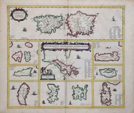 Carta geografica raffigurante Sardegna, Corsica e Isole del Mar Egeo incluse Chios, Rosi, Lemnos e Lesbos. Carta storico/geografica tratta dall'atlante di Georgius HORNIUS "Accuratissima orbis antiqui delineatio sive Geographia vetus sacra & profana", per la prima volta edito nel 1653. Le carte derivano da quelle di Ortelius, pubblicata nel "Parergon". Johannes Janssonius, figlio dell'editore di Arnhem Jan Janssen, sposò Elisabeth Hondius, figlia di Jodocus Hondius, ad Amsterdam nel 1612. Dopo il suo matrimonio, si stabilì in questa città come libraio ed editore di materiale cartografico. Nel 1618 si stabilì ad Amsterdam accanto alla libreria di Willem Jansz. Blaeu, entrando in una seria competizione. Le sue attività non riguardavano solo la pubblicazione di atlanti e libri, ma anche di mappe singole e un vasto commercio di libri con filiali a Francoforte, Danzica, Stoccolma, Copenaghen, Berlino, Koningsbergen, Ginevra e Lione. Nel 1631 iniziò a pubblicare atlanti insieme a Henricus Hondius. Nei primi anni 1640 Henricus Hondius lasciò l'attività di pubblicazione di atlanti completamente a Janssonius. La concorrenza con Joan Blaeu, figlio e successore di Willem, nella produzione di atlanti spinse Janssonius ad ampliare il suo Atlas Novus finalmente in un'opera di sei volumi, in cui furono inseriti un atlante marino e un atlante del Vecchio Mondo. Dopo la morte di Joannes Janssonius, il negozio e la casa editrice furono continuati dagli eredi sotto la direzione di Johannes van Waesbergen (c. 1616-1681), genero di Joannes Janssonius. Le matrici degli atlanti di Janssonius furono in seguito vendute a Schenk e Valck. Incisione in rame, finemente colorata a mano, in buone condizioni. A map of Sardinia & Corsica and nine maps of Aegean Islands in Classical times, including Chios Rhodes, Lemnos and Lesbos. Taken from the HORNIUS, Georgius"Accuratissima orbis antiqui delineatio sive Geographia vetus sacra & profana" first published in Amsterdam in 1653. After Ortelius' map published in the "Parergon". Johannes Janssonius (Arnhem, 1588-1664), son of the Arnhem publisher Jan Janssen, married Elisabeth Hondius, daughter of Jodocus Hondius, in Amsterdam in 1612. After his marriage, he settled down in this town as a bookseller and publisher of cartographic material. In 1618 he established himself in Amsterdam next door to Blaeu’s book shop. He entered into serious competition with Willem Jansz. Blaeu. His activities not only concerned the publication of atlases and books, but also of single maps and an extensive book trade with branches in Frankfurt, Danzig, Stockholm, Copenhagen, Berlin, Koningsbergen, Geneva, and Lyon. In 1631 he began publishing atlases together with Henricus Hondius. In the early 1640s Henricus Hondius left the atlas publishing business completely to Janssonius. Competition with Joan Blaeu, Willem’s son and successor, in atlas production prompted Janssonius to enlarge his Atlas Novus finally into a work of six volumes, into which a sea atlas and an atlas of the Old World were inserted. After the death of Joannes Janssonius, the shop and publishing firm were continued by the heirs under the direction of Johannes van Waesbergen (c. 1616-1681), son-in-law of Joannes Janssonius. The copperplates from Janssonius’s atlases were afterwards sold to Schenk and Valck. Copperplate with fine later hand colour, in good conditions. Cfr. ZACHARAKIS: 1124.