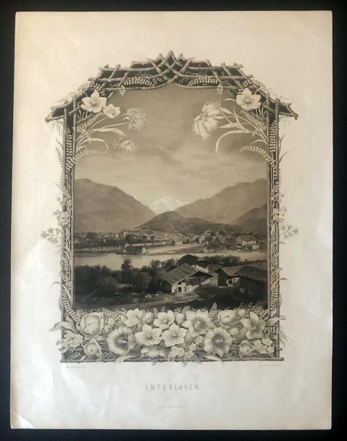 Berlino, R. Wagner, 1870 circa. Litografia, b/n, cm 35,5 x 46,5 (il foglio). Piacevole veduta della cittadina di Interlaken con i monti sullo sfondo e con cornice floreale di decoro. Buono stato. .