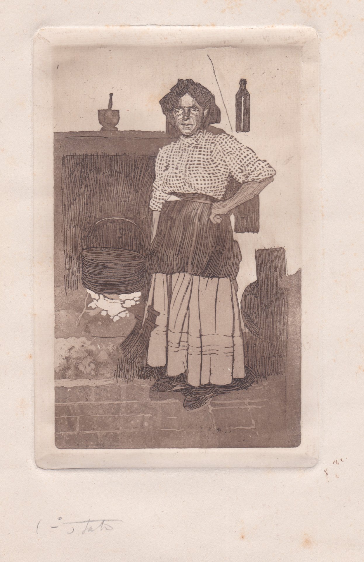 La lastra raffigura l'interno di una abitazione rustica con una popolana, il braccio sinistro poggiato sul fianco. I tratti corti e paralleli ad acquaforte definiscono le zone in ombra e i contorni. Scavano un viso che pare riarso dal sole e dal lavoro degli anni. Un volto che ricorda le figure di Lorenzo Viani, vittime della quotidiana fatica.  L'acquatinta marca il chiaroscuro degli elementi essenziali che costituiscono l'arredo domestico. In basso oltre l'inciso a matita: I stato.