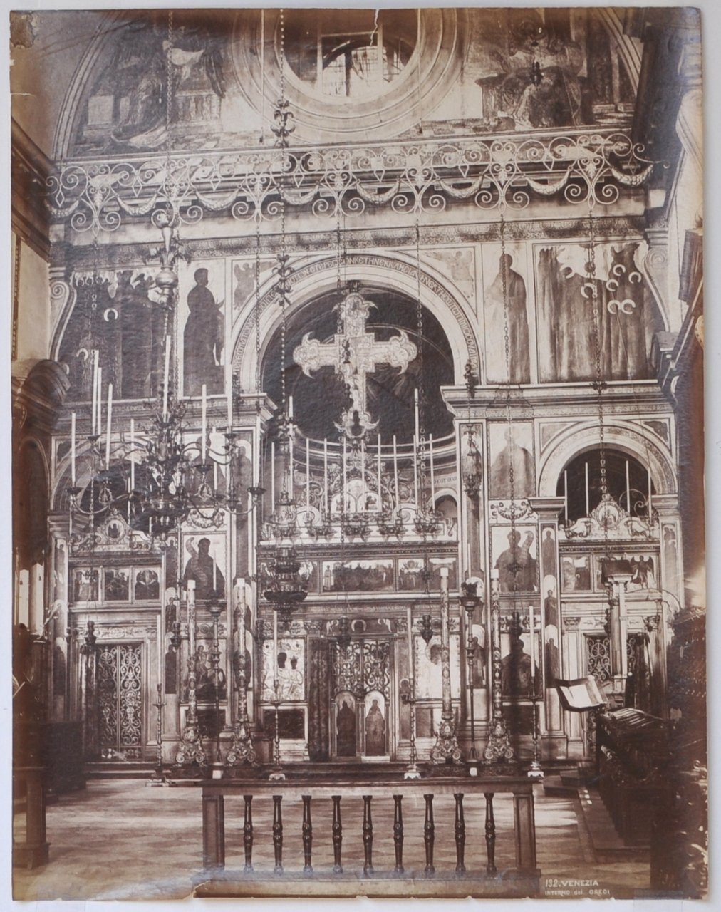 Fotografia originale da gelatina ai sali d'argento su carta baritata di mm 265 x 345. A china, in bianco, come spesso nelle fotografie di Naya, la dicitura : "132 Venezia Interno dei Greci". Carlo Naya (1816-1882) fu uno dei più importanti fotografi italiani del diciannovesimo secolo; piemontese di nascita, di famiglia agiata, si trasferisce a Venezia nel 1857, associandosi con il già celebre fotografo Carlo Ponti, da cui si separerà nel 1868, aprendo due laboratori autonomi.