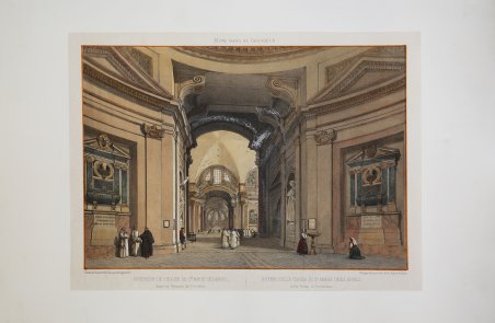 Veduta tratta dalla monumentale opera di Felix Benoist ' Rome dans sa grandeur. Vues, monument ancient et modernes ' stampata a Parigi in 3 volumi, da Henri Charpentier, nel 1870. La pubblicazione, illustrata da 100 litografie, fu preceduta da una campagna di disegni preparatori, a far data dal 1864 sino al 1869, eseguita soprattutto da Félix Benoist e in parte da Philippe Benoist. Alla vigilia del Concilio Ecumenico Vaticano I, l’11 agosto 1869, Pio IX decretava la realizzazione di una ' Esposizione romana delle opere d’ogni arte eseguite per il culto cattolico, che venne inaugurata, il 17 febbraio 1870, nel chiostro della Certosa di Santa Maria degli Angeli. In quell’occasione, vennero presentati i tre volumi in folio ' Rome dans sa grandeur. I volumi, rilegati in modo sfarzoso, con impresso al centro in oro, lo stemma di Pio IX, sono suddivisi in tre sezioni. Il primo volume tratta di ' Roma antica, il secondo, di ' Roma cristiana, ed il terzo, dei monumenti e le realizzazioni della ' Roma moderna. Una visione preziosa della Roma papale alla vigilia della profonda trasformazione di Roma in capitale dell’Italia unita. Un documento che evidenzia la notevole impronta lasciata da Pio IX nella Città Eterna. L’opera rappresenta il capolavoro dell’artista francese, dove ogni veduta è realizzata in litografia tinta, processo ottenuto usando un diverso numero di pietre. Il risultato è un’opera di grande effetto, tanto da porre il Benoist tra la schiera dei più grandi artisti di interni e vedute del suo tempo. Litografia tinta, finemente colorata a mano, in ottimo stato di conservazione. View taken from the monumental work of Felix Benoist ' Rome dans sa grandeur. Vues, monument ancient et modernes ' printed in Paris in 3 volumes, by Henri Charpentier, in 1870. The publication, illustrated by 100 lithographs, was preceded by a campaign of preparatory drawings, from 1864 to 1869, executed mainly by Felix Benoist and partly by Philippe Benoist. On the eve of the First Vatican Ecumenical Council, August 11, 1869, Pius IX decreed the creation of the ' Esposizione romana delle opere d’ogni arte eseguite per il culto cattolico ' (a Roman Exhibition of the works of art created for Catholic worship), which was inaugurated on February 17, 1870, in the cloister of the Charterhouse of Santa Maria degli Angeli. On that occasion, the three volumes in folio ' Rome dans sa grandeur ' were presented. The volumes, magnificently bound, with the coat of arms of Pius IX stamped in gold in the center, are divided into three sections. The first volume deals with ancient Rome, the second with “Christian” Rome, and the third with the monuments and achievements of modern Rome. A precious vision of papal Rome on the eve of the profound transformation of Rome into the capital of united Italy. A document that highlights the remarkable imprint left by Pius IX in the Eternal City. The work represents the masterpiece of the French artist, where each view is made in tinted lithography, a process achieved by using a different number of stones. The result is a work of great effect, so much so as to place Benoist among the ranks of the greatest artists of interiors and views of his time. Tinted lithograph, finely hand-colored, in excellent condition. Cfr.