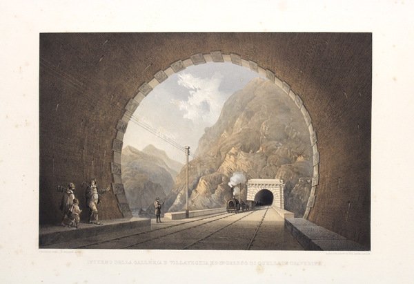 Litografia, mm 288x440, impressa a colori d’epoca eseguita da E. Walker. Tratta da “Views of the railway between Turin and Genoa” Carlo Bossoli (Lugano 1815 – Torino 1884) fu un pittore che viaggiò a lungo fra i Paesi europei, Asia Minore e Marocco, come “vedutista reporter”, acquistando fama, soprattutto in Inghilterra, grazie alle raffigurazioni di panorami e scene di guerra, nelle quali l’esattezza dei particolari si univa a una percezione tardo-romantica dei paesaggi naturali. Dal ministro Paleocapa del Regno Sabaudo ricevette l’incarico di immortalare in sedici tavole la costruzione della ferrovia Torino – Genova che, per il piccolo Stato subalpino, era un’opera di grande rilevanza. Bossoli produsse una serie di sedici dipinti a tempera da cui furono ricavate litografie edite la prima volta a Londra nel 1853, sotto il titolo sotto il titolo Views of the railway between Turin and Genoa. Le vedute ritraggono alcuni ponti ferroviari, come quello sul Po presso Moncalieri, quello sul Tanaro poco fuori Alessandria e quello stupendo di Prarolo, sullo Scrivia, nonché l’ingresso di alcune gallerie (Giovi, Villavecchia), stazioni, come quella di Novi Ligure, e altri punti caratteristici del percorso. Ottimo esemplare con minime fioriture su foglio ad ampi margini.