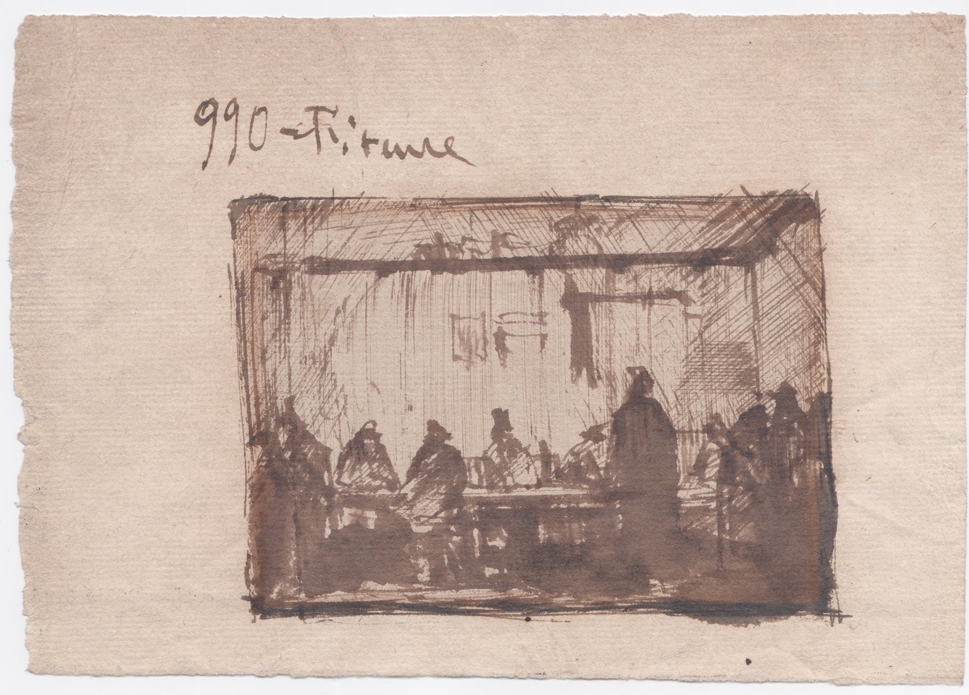 Il segno affilato e l'ampio uso dell'inchiostro diluito definiscono i contorni di un interno con alcune figure in piedi intorno a un tavolo. Lo stesso soggetto, in controparte e in format simile, è stato affrontato in un'incisione intitolata interno di osteria. Nella scheda dell'esemplare conservato a Cagliari si propone una datazione agli anni Cinquanta ma probabilmente da datare a agli anni Trenta. Disegno eseguito su frammento di carta antica. Sopra il soggetto: 990 Firenze.