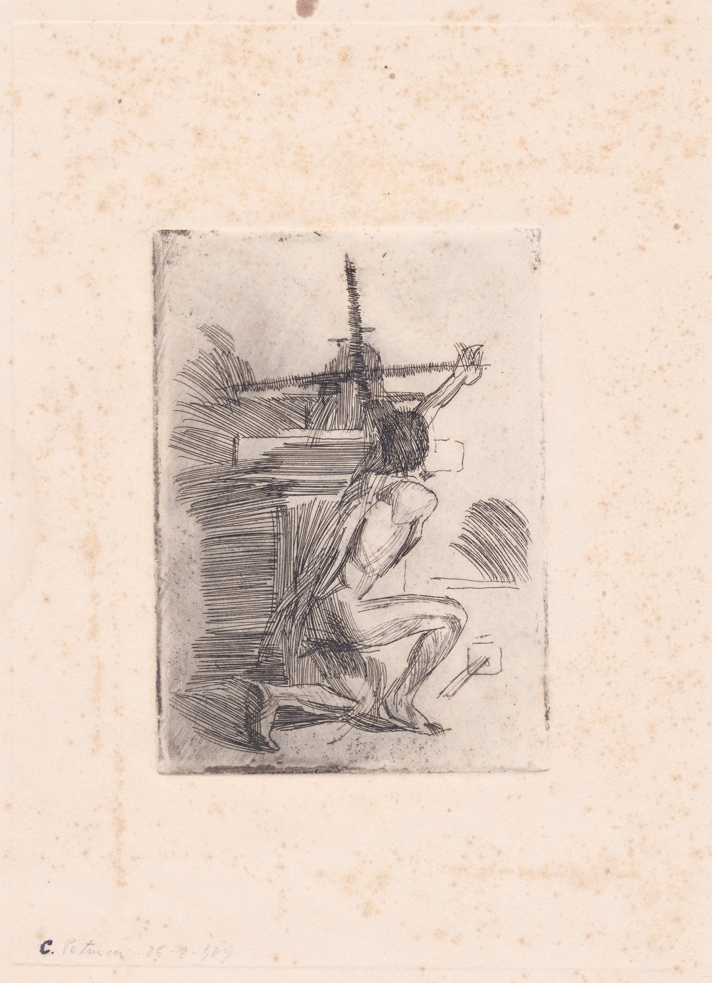 Nel foglio l'artista rappresenta l'interno di una stamperia, un uomo inginocchiato di spalle e nudo che sta azionando un torchio a stella. I tratti lunghi e nervosi conferiscono dinamicità alla composizione. Un leggero velo di inchiostro lascia una zona bianca sulla schiena dell'uomo. Nell'angolo inferiore sinistro a matita si legge “C. Petrucci 26.2.1909”. L'opera proviene dalla collezione degli eredi Torossi, già medico e amico di Petrucci (esposto presso questa stessa galleria nel 2018 in occasione della mostra monografica su Petrucci), poi collezione Bariletti, Roma.