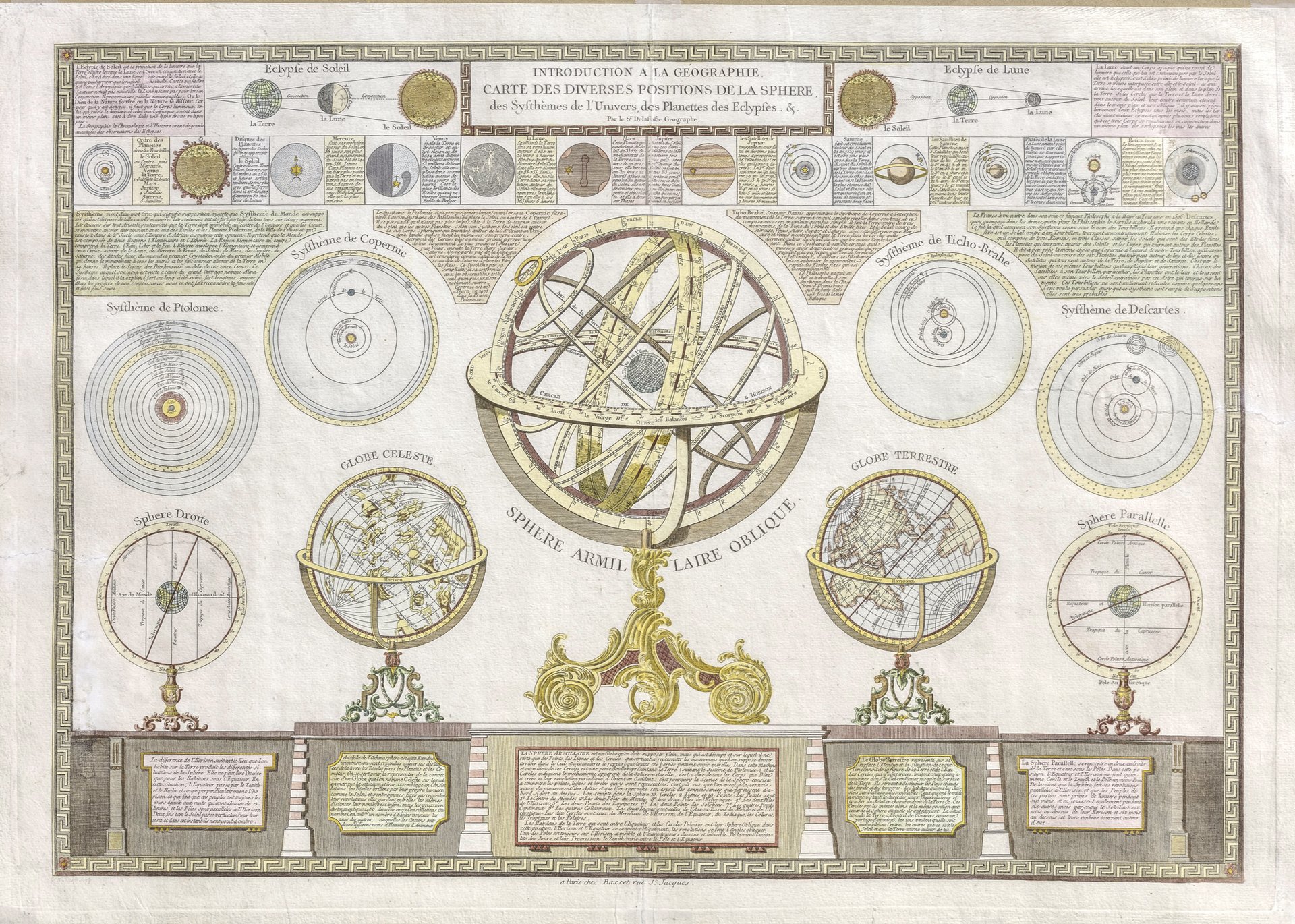 Introduction a la géographie. Carte des diverses positions de la sphere, des Systhèmes de l'Univers, des Planettes des Eclypses.