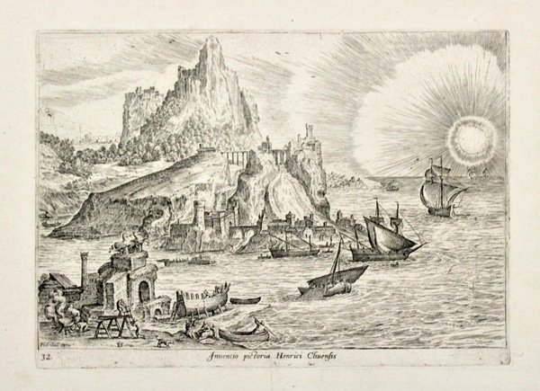 Incisione a bulino, mm 172x244; bella impressione su carta vergata coeva, in ottimo stato di conservazione con ampi margini, monogrammata in lastra "HVC" e firmata "Phls. Gall excu" entrambe a sinistra. Veduta inserita nella raccolta "Ruinarum varii prospectus, ruriumque aliquot delineationes", edita da Philip Galle nel 1587.<BR>Hendrick van Cleve o Cliven III, figlio e allievo di William van Cleve, si trasferisce in Italia nella metà del XVI secolo; oltre ad un dipinto raffigurante una veduta di Roma, datato 1550, realizza un cospicuo numero di disegni che serviranno come modelli per l'opera incisa da Galle. Si formò nella cerchia di Frans Floris, il maestro fiammingo che dal 1540 ca. divenne ad Anversa il caposcuola dei "romanisti". Durante un viaggio in Italia disegnò paesi e rovine.