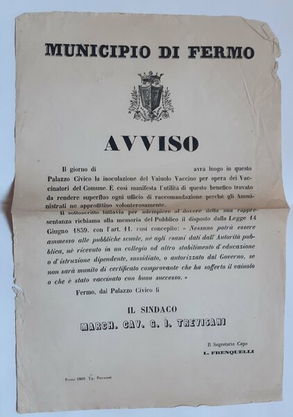 Municipio di Fermo invito a vaccinarsi contro il vaiolo 1869