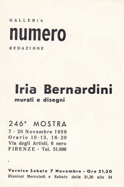 Invito IRIA BERNARDINI murali e disegni. Galleria Numero mostra 246°. 1959