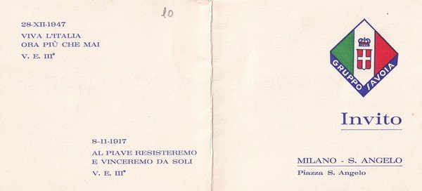 Invito per il XVIII anniversario dalla morte di S.M il Re VITTORIO EMANUELE III. Gruppo Savoia presso la chiesa S.Angelo - Milano. 1965