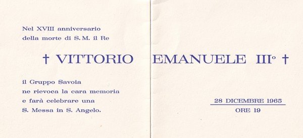 Invito per il XVIII anniversario dalla morte di S.M il Re VITTORIO EMANUELE III. Gruppo Savoia. 1965