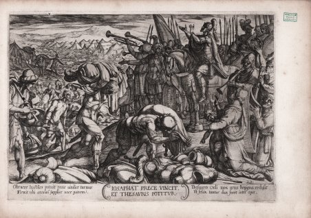 Acquaforte, circa 1613, monogrammata e numerata in lastra. Della serie "Sacra Bella Sanctae Veterum Bibliorum Historiae".Magnifica prova, particolarmente nitida e ricca di toni, impressa su carta vergata coeva, con margini oltre l’impronta del rame, in eccellente stato di conservazione. La tavola appartiene alla serie di 25 incisioni (numerate 1-24 più il frontespizio) che raffigurano scene con battaglie del Vecchio Testamento, stampate a Roma da Nicolas van Aelst nel 1613.Il frontespizio riporta la data e i dettagli editoriali "Nicolaus Van Aelst Formis" e "Romae superiorum permissum", oltre alla dedica di Tempesta a Cosimo II: "Serenissimo principi Cosmo II magno hetruriae duci Antonius Tempesta felicitatem". Etching, circa 1613, from the series "Sacra Bella Sanctae Veterum Bibliorum Historiae". Magnificent proof, with very good contrast and rich tonalities, printed on contemporary laid paper, margins extending beyond the platemark, in excellent conditions.Parte of the series of 25 prints numbered 1 to 24 plus frontispiece, depicting scenes from the Old Testament.The title page, is dated and lettered within image with publication detail: "Nicolaus Van Aelst Formis" and "Romae superiorum permissum" and with Latin dedication to Cosimo II and production detail beginning "Serenissimo principi Cosmo II magno hetruriae duci Antonius Tempesta felicitatem". Cfr. Bartsch XVII.129.257.