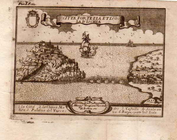 ISCHIA - "Città Fortezza et isola d'Ischia". Simpatica veduta dell'isola collegata alla terraferma da un ponte, mare e veliri tutt’intorno. Elenco dei luoghi notabili 1-6
