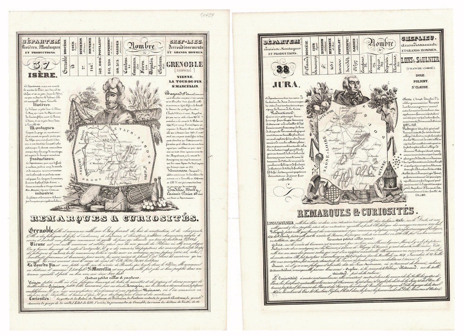 Carta n°37 del Dipartimento di Isère inserita in un medaglione centrale sormontato da un ritratto di Bayard. Questa è circondata da spiegazioni e osservazioni riguardanti l'economia, la geografia e la storia di quel territorio in cui si evidenziano le cittadine di Grenoble (Dauphiné), Vienne, La Tour du Pin, St. Marcellin.Al retro la carta n° 38 del Dipartimento de Jura inserita in un medaglione centrale sormontato da un ritratto del Generale Charles Pichegru. Anche questo è circondato da spiegazioni e osservazioni riguardanti l'economia, la geografia e la storia di quel territorio in cui si evidenziano le cittadine di Lons le saulnier (France - Comté), Dole, Poligny, St. Claude.Inserita nell'opera "Nouvelle Géographie et Statistique de La France Alger et La Belgique, Suive d'un Traité sur le Mone entier. Ornée de 95 cartes approuvée de l'Université pa J. Henry, maitre de Pension" edita dall'Autore Alexandre Corbin Litografo ed editore a Tours nel 1842
