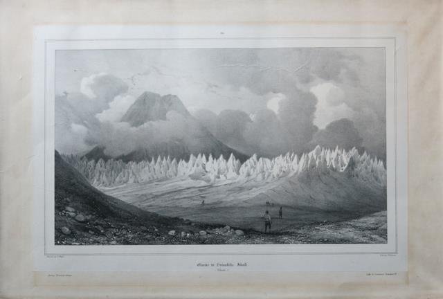 1840 circa. Litografia su carta di cina applicata su coevo e sottile cartoncino sottostante, b/n, cm 29,5 x 44,5 circa (il foglio figurato) più margini, sulla sinistra "Dessiné par A. Mayer" e "Arthus Bertrand éditeur", sulla destra "Lith. par Villeneuve" e "Lith. De Lemercier, Bénard et C.ie". Piacevole veduta animata del ghiacciaio di Svinafell.