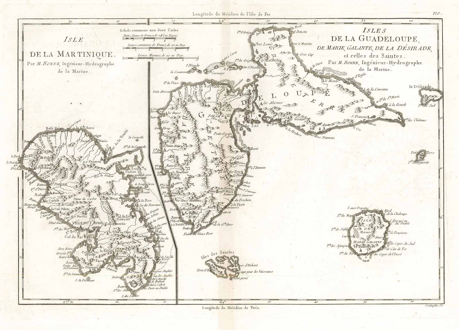 Carta geografica, antica ed originale, raffigurante l'isola di Martinica e quella di Guadalupe. Piega centrale editoriale. Rigobert Bonne (1727-1795) fu uno dei più importanti cartografi del tardo XVIII secolo. Nel 1773 succedette a Jacques Bellin come cartografo reale in Francia.