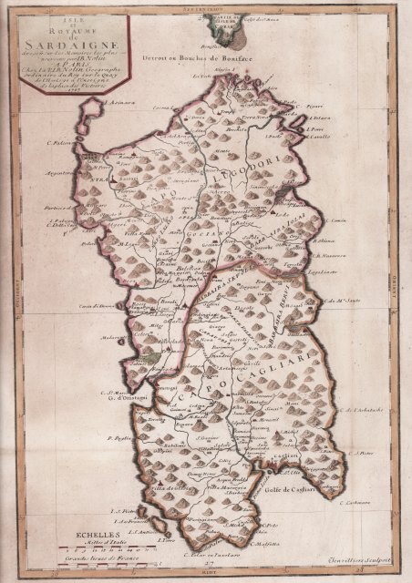 La carta della Sardegna, incisa da Ienvilliers, era inserita in Le Théâtre du monde, pubblicato a partire dal 1700 e continuamente riedito con aggiunte e modifiche. Graduata ai margini, presenta due scale grafiche. La semiologia della carta è ancora quella tradizionale, con le montagne simboleggiate da piccoli mucchi di talpa colorati in marrone, i fiumi a tratto forte, le coste tratteggiate e bordate in azzurro. Una serie di puntini delimita due vaste zone identificate come Capo Lugodori e Capo Cagliari. Questa stessa carta era stata inclusa anche in Nouvelle ediction du Théâtre de la guerre en Italie, contenent les cartes particulieurs de tous les états d'Italie et plusieurs provinces des dits états . dello stesso Nolin. La tipografia Nolin venne fondata da Jean Baptiste Nolin (1657-1708 circa) che intraprende l’attività editoriale di famiglia a Parigi, in Rue St. Jacques, dove il padre aveva una bottega d’incisione. Allievo di Francois de Poilly, verso la fine del secolo iniziò a godere di una certa notorietà fino a diventare “graveur ordinaire du roi, marchand de tailles douces” e, nel 1694, “géographe du duc d’Orléans”, fratello di re Louis XIV. Alla scomparsa del duca, nel 1701, assunse la qualifica di “geographe du Roy”. La sua carriera ebbe una certa evoluzione dopo l’incontro con l’abate Vincenzo Maria Coronelli che gli affidò l’incisione del suo grande globo celeste di 28 fusi. Nolin, non essendo un geografo vero e proprio, aveva difficoltà a realizzare carte originali e, pertanto, si rifaceva a modelli di altri geografi. Molte delle sue opere si basano sulle incisioni di Coronelli - alcune realizzate in collaborazione - e di un altro cartografo francese, Jean Nicolas de Tralage detto Tillemon. Altra fonte per le sue carte furono le informazioni che arrivavano dalle guerre in Europa, alle quali aveva accesso essendo “geographe du Roy”. Nel 1701 stesso il Nolin pubblicò Le Theatre de la Guerre en Italie, una raccolta composta da iniziali 18 carte che fu bene presto ristampata e aggiornata. Incisione in rame, finemente colorata a mano, consuete pieghe di carta, in buono stato di conservazione. The map is made for Le Theatre de la Guerre en Italie, first published in 1701. The work describes in detail the Italian Campaign of 1701-1702 which involved territories of northern Italy with Milan, Cremona, Mantua, Parma, Modena, Bergamo, Crema, Brescia, Verona, Vicenza, Padua, Ferrara and Bologna. Jean-Baptiste Nolin (ca. 1657-1708) was a French engraver who worked at the turn of the eighteenth century. Initially trained by Francois de Poilly, his artistic skills caught the eye of Vincenzo Coronelli when the latter was working in France. Coronelli encouraged the young Nolin to engrave his own maps, which he began to do. ' Whereas Nolin was a skilled engraver, he was not an original geographer. Nolin, had difficulty in making original maps and, therefore, referred to models of other geographers. Many of his works are based on the engravings of Coronelli - some made in collaboration - and another French cartographer, Jean Nicolas de Tralage called Tillemon. Another source for his maps was the information that came from the wars in Europe, to which he had access being "geographe du Roy". In 1701 the same Nolin published Le Theatre de la Guerre en Italie, a collection consisting of initial 18 maps that was soon reprinted and updated. Copper engraving, fine later hand colour, in good condition. Cfr. L. Piloni, "Carte geografiche della Sardegna", p. 156, tav. LXII (I).