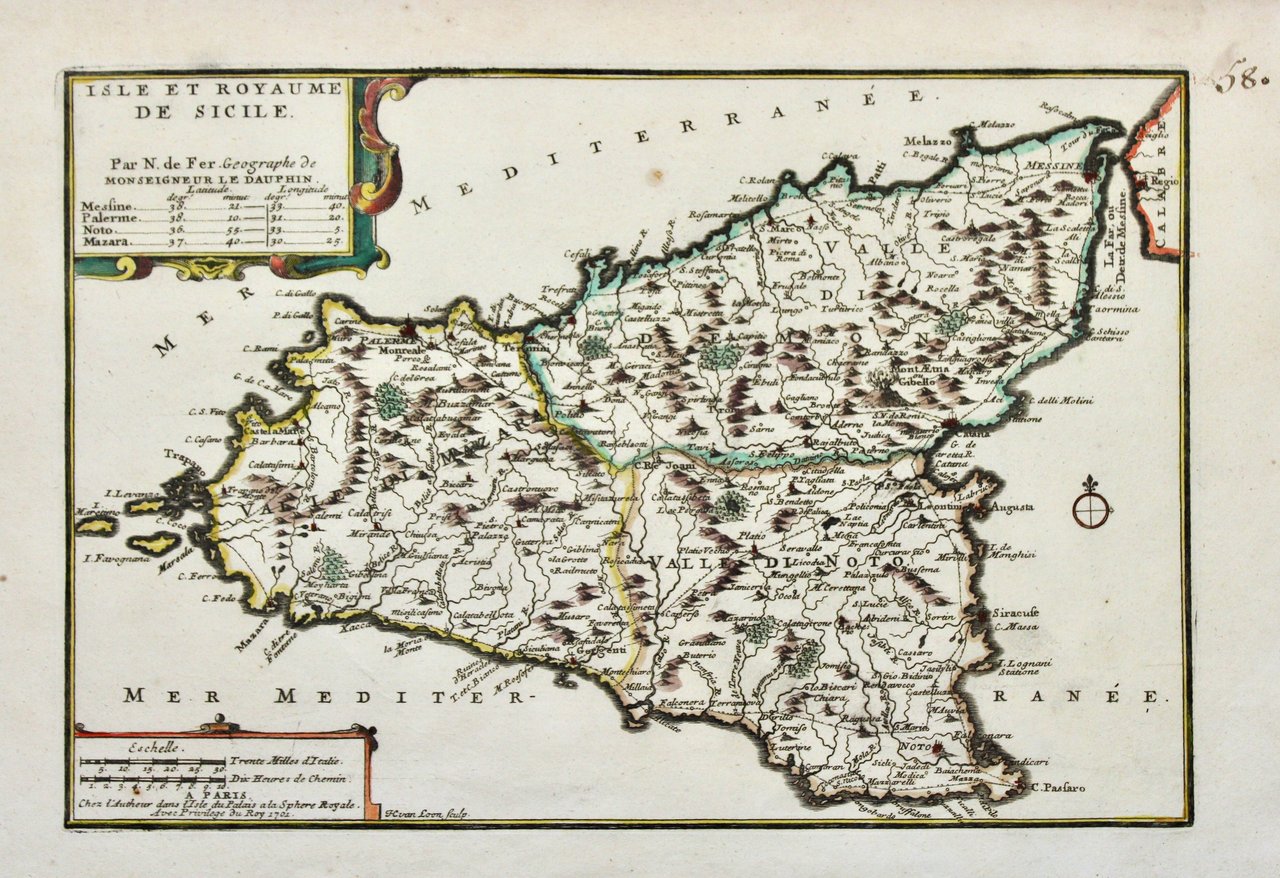 Incisione in rame, colorata, mm 225x336. Tratta da "Atlas curieux". Ottimo esemplare. Valerio-Spagnolo, Sicilia 1477-1861. La collezione Spagnolo-Patermo in quattro secoli di cartografia. <BR><BR>