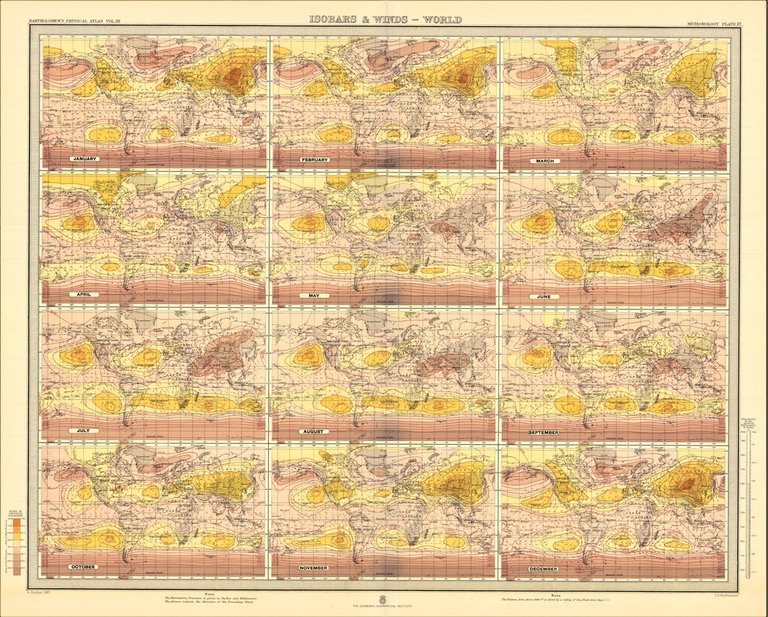 Carta geograficameteorologica originale raffigurante le isobare ed i venti nel mondo durante i 12 mesi dell'anno 1897. Inserita nell'opera "Bartholomew's Physical Atlas - Volume III. Atlas of Meteorology. A Series of over Four Hundred Maps. Prepared by J.G. Bartholomew . A.J. Herbertson . Alexr. Buchan. Under the Patronage of the Royal Geographical Society. Prepared at the Edinburgh Geographical Institute".