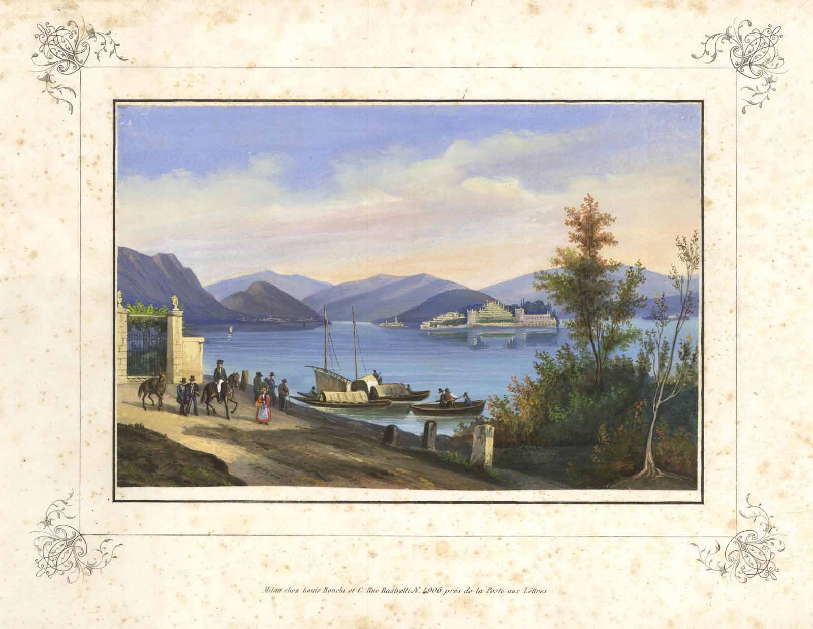 Veduta dell'Isola Bella ripresa dalla riva nei pressi di Stresa. L'incisione è caratterizzata da una splendida coloritura coeva alla gouache ed acquerello con rialzi alla gommalacca. Si presenta rifilata ed applicata editorialmente sul foglio fatto appositamente realizzare da Luigi Ronchi, del quale, in calce al centro, compare l'indicazione editoriale. L'incisione deve far parte di una serie di vedute acquisite dal Ronchi, fatte colorare e montare sul foglio appositamente realizzato per l'occasione il quale è impreziosito dalla decorativa greca a motivi floreali angolari che racchiude la veduta. Assai rara. Variante non menzionata nella bibliografia di riferimento. Ottimo lo stato di conservazione