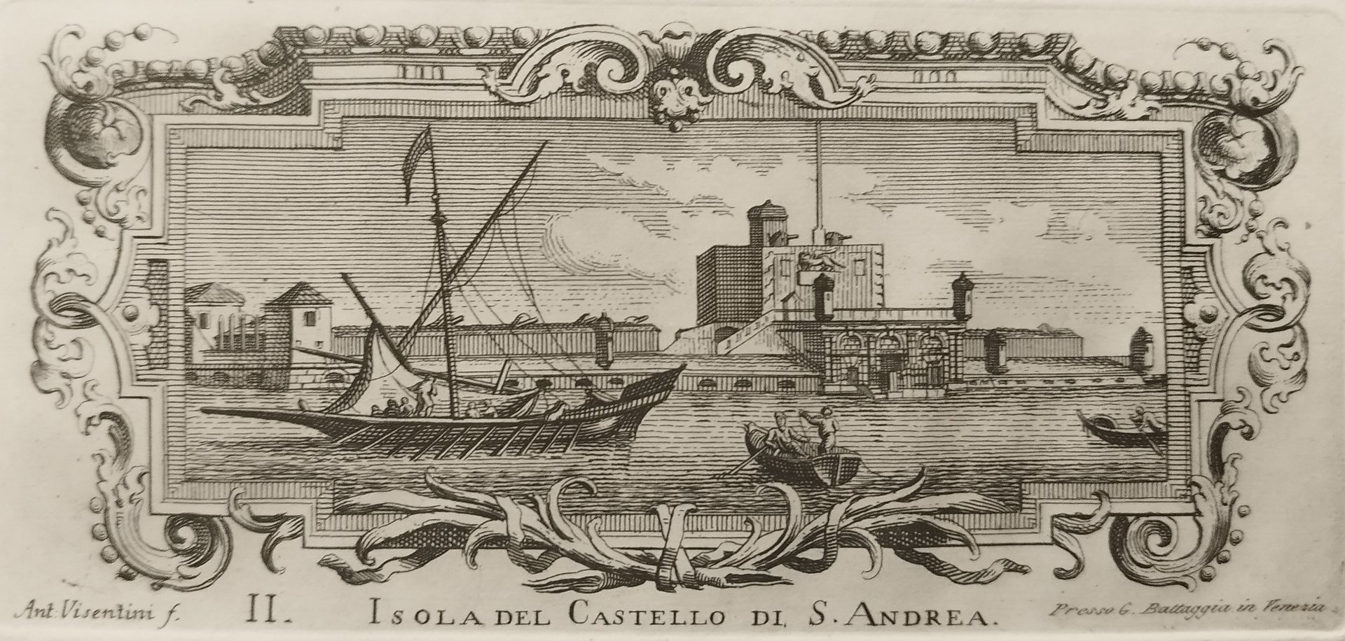 Incisione in rame di mm 178 x 80 alla battuta su foglio di cotone di mm 275 x 200. Tav II. Tratto da: "Isolario veneto, ovvero Prospettive di XX. Isole situate intorno alla citta di Venezia, disegnate con esattezza, contornate con nobile varietà di ornati; e con maestria incise dal celebre Antonio Visentini pittor, ed architetto, ora in un volume raccolte, e disposte secondo l'ordine di alfabetto. Aggiuntavi una carta topografica, che ne mostra la situazione, e l'indice storico delle medesime. Dedicate al nobile, e magnanimo sig.r Tommaso Moore Slade cavaliere inglese . " da Teodoro Viero. D. Succi, Le vedute lagunari . Gli stessi rami erano stati utilizzati per le testatine della celebre opera di Guicciardini "l'Istoria d'Italia" stampata da Pasquali nel 1738. (EN) Copper engraving measuring 178 x 80 mm at the edge on cotton sheet measuring 275 x 200 mm. Plate II. Taken from: "Veneto Isolario, or Perspectives of XX. Islands located around the city of Venice, drawn with precision, surrounded with noble variety of ornaments; and with mastery engraved by the famous Antonio Visentini painter and architect, now in a collected volume, and arranged according to alphabetical order. Added a topographical map, which shows the situation, and the historical index of the same. Dedicated to the noble and magnanimous Mr Tommaso Moore Slade, an English knight . " by Teodoro Viero. D. Succi, The lagoon views. The same branches had been used for the headers of Guicciardini's famous work "l'Istoria d'Italia" printed by Pasquali in 1738.