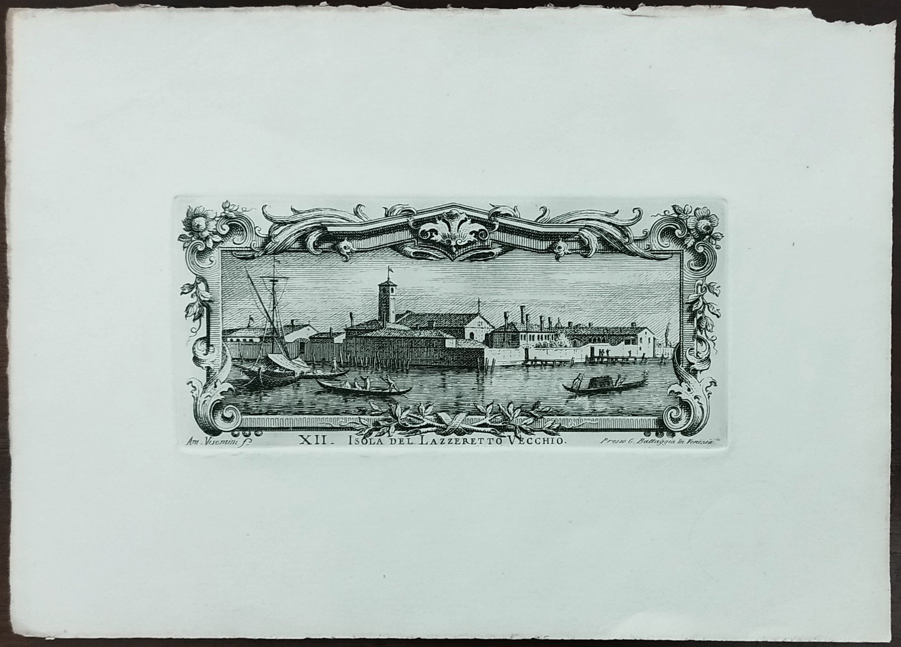 Incisione in rame di mm 174 x 76 alla battuta su foglio di cotone di mm 275 x 200. Tav XII. Tratto da: "Isolario veneto, ovvero Prospettive di XX. Isole situate intorno alla citta di Venezia, disegnate con esattezza, contornate con nobile varietà di ornati; e con maestria incise dal celebre Antonio Visentini pittor, ed architetto, ora in un volume raccolte, e disposte secondo l'ordine di alfabetto. Aggiuntavi una carta topografica, che ne mostra la situazione, e l'indice storico delle medesime. Dedicate al nobile, e magnanimo sig.r Tommaso Moore Slade cavaliere inglese . " da Teodoro Viero. D. Succi, Le vedute lagunari . Gli stessi rami erano stati utilizzati per le testatine della celebre opera di Guicciardini "l'Istoria d'Italia" stampata da Pasquali nel 1738. (EN) Copper engraving measuring 174 x 76 mm at the edge on cotton sheet measuring 275 x 200 mm. Plate XII. Taken from: "Veneto Isolario, or Perspectives of XX. Islands located around the city of Venice, drawn with precision, surrounded with noble variety of ornaments; and with mastery engraved by the famous Antonio Visentini painter and architect, now in a collected volume, and arranged according to alphabetical order. Added a topographical map, which shows the situation, and the historical index of the same. Dedicated to the noble and magnanimous Mr Tommaso Moore Slade, an English knight . " by Teodoro Viero. D. Succi, The lagoon views. The same branches had been used for the headers of Guicciardini's famous work "l'Istoria d'Italia" printed by Pasquali in 1738.