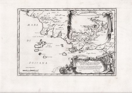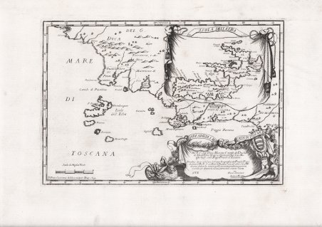 Splendida ed assai rara carta dell'arcipelago toscano e dell'Elba in particolare, inserita in un cartiglio separato. Dedicata a Marino Carafa, principe di Maddaloni. Mappa tratta dall’ ' Accuratissima e Nuova Delineazione del Regno di Napoli, con le sue Provincie distinte… da Antonio Bulifon. In Napoli, L’anno MDC.XCII. La ' Accuratissima e Nuova Delineazione del Regno di Napoli ' è il primo atlante interamente concepito, disegnato, inciso e stampato a Napoli. Le carte sono tutte incise e firmate dallo spagnolo Francesco Cassiano de Silva e pubblicate dal libraio di origine francese Antonio Bulifon (1649-1714). Nel 1692 si ebbe una prima tiratura dell'atlante con 20 tavole; Bulifon dedicò l'atlante del Regno di Napoli a Cosimo III granduca di Toscana, il "più gran signore che Terre in quello possiede", come recita nella dedica della tavola del regno. Intermediario tra l'editore napoletano e il granduca fu Antonio Magliabechi con il quale Bulifon intrattenne un lungo e interessante carteggio. Della vita di Francesco Cassiano de Silva si possiedono scarsissime informazioni; cionondimeno, è indubbia la sua fama come incisore di molte opere relative al Regno di Napoli. In particolare, incise per commissione opere pubblicate dai più importanti editori di Napoli del suo periodo, cioè Antonio Bulifon, Domenico Antonio Parrino e Luigi Mutio. Collaborò anche con Giovan Battista Pacichelli. Le fonti sono discordanti sulla sua origine; alcune fonti affermano che era milanese, mentre altre fonti affermano che era spagnolo. L'ultimo suo lavoro certo è un atlante manoscritto conservato nella Biblioteca Nazionale di Vienna, terminato nel 1708. In tale ultima opera si firma "nobile milanese", mentre nelle precedenti incisioni si era sempre fregiato del titolo di "hispanicus". I due dati potrebbero non essere in contraddizione in quanto Francesco potrebbe appartenere ad un ramo cadetto della famiglia spagnola dei Silva stanziatasi nel milanese nel corso del XVI secolo. È molto probabile che con la venuta degli austriaci nel Regno di Napoli, nel 1707, Francesco Cassiano de Silva abbia preferito riferirsi alle più prossime e meno pericolose origini milanesi. ' ' Egli risulta coinvolto anche nella realizzazione delle immagini delle varie città e terre del Regno di Napoli avviate tra il 1692 ed il 1695 da Giovambattista Pacichelli quale corredo iconografico al suo libro ' Il Regno di ' Napoli ' in ' prospeniva, ' consegnato per le stampe nel 1692 agli editori Mutio e Parrino. Dell’atlante si conoscono 3 edizioni diverse stampate nel 1692, composte prima da 20 e poi da 21 carte. L’ultima edizione, postuma, venne curata nel 1734 da Luigi Bulifon, nipote di Antonio. Da notare che i rami delle carte geografiche andarono dispersi durante l'occupazione di Napoli da parte degli Austriaci nel 1707. Solamente il fortunoso ritrovamento degli stessi nel 1734 ad opera di Luigi Bolifoni, rientrato a Napoli al seguito di Carlo di Borbone, permise la pubblicazione di questa edizione dedicata al nuovo Re. Si compone di sole 19 carte, in quanto probabilmente la lastra della carta del Molise e di quella della Sardegna non furono recuperate. Incisione in rame, in ottimo stato di conservazione. Bibliografia V. Valerio, ' Il primo atlante a stampa del Regno di Napoli di Francesco Cassiano de Silva, in “Amate sponde Le Rappresentazioni dei Paesaggi Costieri Mediterranei”, Gaeta, 2003; V. Valerio, ' Sicilia 1477-1861, la collezione Spagnolo-Patermo in quattro secoli di cartografia, ' 2014; G. Amirante, M. R. Pessolano, Immagini di Napoli e del regno. Le raccolte di Francesco Cassiano de Silva ' (2006); ' Almagià, Studi, p. 313; Cartografia e storia: la raccolta Graziani pp. 58,90 n°77. Geographic map taken from the "Accuratissima e nuova delineazione del Regno di Napoli con le sue provincie distinte" published by Antonio Bulifon. The work, planned by Francesco Cassiano de Silva, is the first geographic atlas entirely planned, drawn and engraved in Naples and represents the first atlas about the Neapolitan Kingdom. The atlas is dedcated to Cosimo III de' Medici and printed in 1692; there is a postumous edition, edited by the nephew Luigi, and printed in 1734 with the title " Carte de’ Regni di Napoli e di Sicilia". A third edition was published in 1788. Copperplate, engraved by Cassiano da Silva, in excellent condition. Cfr.
