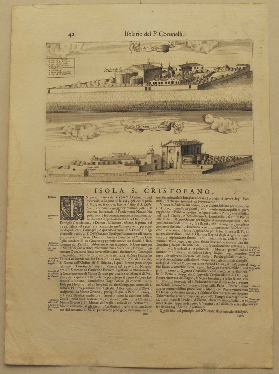 Incisione con doppia veduta di mm 275 x 189 su foglio di mm 354 x 483 proveniente dal "Isolario, descrittione geografico-historica, sacro-profana, antico-moderna, politica, naturale, e poetica. Mari, golfi, seni, piagge, porti, barche, pesche, promontorj, monti, boschi, fiumi . ed ogni piu esatta notitia di tutte l'isole coll'osservationi degli scogli sirti, scagni, e secche del globo terracqueo. Aggiuntivi anche i ritratti de' dominatori di esse. Ornato di trecento-dieci tavole geografiche, topografiche, corografiche, iconografiche, scenografiche . a' maggiore dilucidatione, ed uso della navigatione, et in supplimento dei 14 volumi del Bleau. Tomo II. dell'Atlante veneto. Opera, e studio del p. maestro Vincenzo Coronelli .". (P. 42). Si tratta dell'isola che anche nell'incisione è definita di S. Cristoforo. E. Armao, Vincenzo Coronelli p.116-124; E.A. Cicogna, Saggio di bibliografia veneziana p.617-618 n.4588; NUC pre-1956 v.123 p.316; Un intellettuale europeo e il suo universo . a cura di M.G. Tavoni p.219