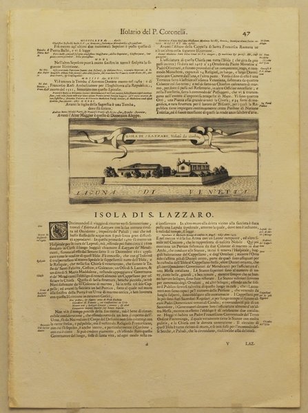Incisione calcografica di mm 187 x 122 su foglio di mm 460 x 360. Nel carteggio :"Isola di S. Lazzaro, Veduta da Garbino". Proveniente dal "Isolario, descrittione geografico-historica, sacro-profana, antico-moderna, politica, naturale, e poetica. Mari, golfi, seni, piagge, porti, barche, pesche, promontorj, monti, boschi, fiumi . ed ogni piu esatta notitia di tutte l'isole coll'osservationi degli scogli sirti, scagni, e secche del globo terracqueo. Aggiuntivi anche i ritratti de' dominatori di esse. Ornato di trecento-dieci tavole geografiche, topografiche, corografiche, iconografiche, scenografiche . a' maggiore dilucidatione, ed uso della navigatione, et in supplimento dei 14 volumi del Bleau. Tomo II. dell'Atlante veneto. Opera, e studio del p. maestro Vincenzo Coronelli .". (P. 49). Tutto il resto della pagina edil retro è occupato dalla storia a partire dalle origini, dell'isola. E. Armao, Vincenzo Coronelli p.116-124; E.A. Cicogna, Saggio di bibliografia veneziana p.617-618 n.4588; NUC pre-1956 v.123 p.316; Un intellettuale europeo e il suo universo . a cura di M.G. Tavoni p.219