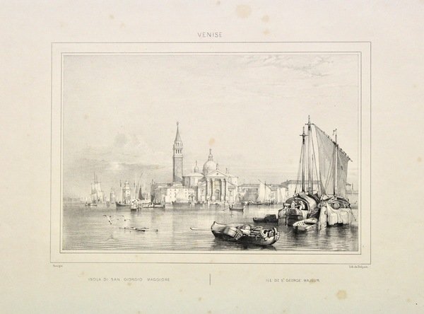 Litografia eseguita su disegno di Roaurgue, mm 190x287. Bella veduta di San Giorgio arricchita da scene di vita lagunare; esemplare assai marginoso con saltuarie fioriture ai margini.