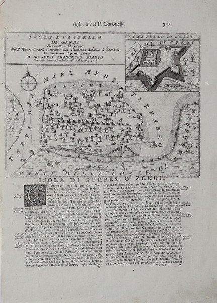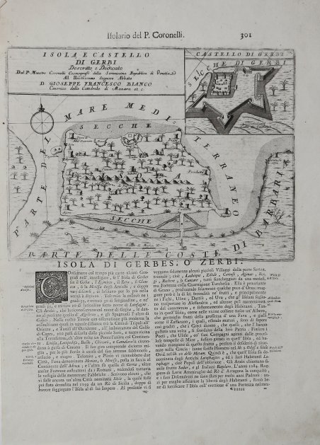 Carta raffigurante Djerba, tratta dall’Isolario dell’Atlante Veneto del P. Coronelli, In Venetia MDCXCVI. Coronelli visse un periodo di straordinaria fecondità editoriale a partire dal 1689, quando ebbe la cattedra di geografia presso l'Università alle Procuratie, con la pubblicazione, nel 1690, del primo volume dell'Atlante Veneto. In effetti sotto il nome di ' Atlante Veneto ' va tutta la raccolta di tredici opere composte nell'arco del decennio successivo, dall'Isolario ' allo ' Specchio del mare. L'Isolario ' mira, con una barocca e minuziosa ricerca del dettaglio, alla celebrazione dei possedimenti della Serenissima. Monumentale raccolta di carte e vedute di isole, rappresenta l'ultimo degli “isolari” concepiti, che, tra la fine del XVII e l'inizio del XVIII secolo, vennero progressivamente soppiantati dagli atlanti di moderna concezione, opere a stampa caratterizzate da crescente precisione scientifica e da sempre minore pregio artistico. Sulla scia delle nuove conquiste coloniali le rappresentazioni cartografiche vennero ad assumere un carattere sempre più tecnico, fino ad allora piuttosto arbitrario. Esemplare in buone condizioni. Decorative map of Djerba, taken from ' Isolario dell’Atlante Veneto del P. Coronelli, In Venetia MDCXCVI. Coronelli lived a period of extraordinary editorial fecundity starting from 1689, when he had the chair of geography at the University at the Procuratie, with the publication, in 1690, of the first volume of the ' Atlante Veneto. Under the name of ' Atlante Veneto ' goes the entire collection of thirteen works composed over the next decade, from the ' Isolario ' to the ' Specchio del mare. The ' Isolario ' aims, with a baroque and meticulous search for detail, to celebrate the possessions of the Serenissima. Monumental collection of maps and views of islands, represents the last of the "isolarios" conceived, which, between the end of the seventeenth and the beginning of the eighteenth century, were gradually supplanted by modern atlases, printed works characterized by increasing scientific precision and less and less artistic value. In the wake of the new colonial conquests, cartographic representations came to assume an increasingly technical character, until then rather arbitrary. Coronelli was possibly the best Italian mapmaker of his time. He made globes, including one 5 meters in diameter for Louis XIV. From Coronelli's rare Atlante Veneto, one of the most decorative and ornate of all 17th Century Atlases. The map exhibits the fine engraving style of this coveted Venetian Atlas.Copperplate, good condition. Cfr.