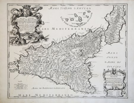 La mappa è una delle più dettagliate e aggiornate della Sicilia e delle isole limitrofe. Include due cartigli ornati e una dedica al "Signore Don Gaspar De Aro E Gusman". Giacomo Cantelli, nativo da Vignola come egli fa notare nella sua firma, fu il primo cartografo ufficiale della corte di Modena, dal 1685, anno in cui il duca Francesco II lo nominò geografo e conservatore della biblioteca ducale. ' Carta geografica tratta dal ' Mercurio geografico overo Guida Geografica in tutte le parti del Mondo conforme le Tavole Geografiche del Sansone Baudran de Cantelli Data in luce con direttione, e cura di Gio. Giacomo de Rossi nella sua stamperia ' raccolta di carte edita a Roma tra il 1660 ed il 1730 dalla tipografia De Rossi - la datazione delle carte va dal 1669 al 1715 - la cui prima stesura si deve a Giovanni Giacomo de Rossi. Nel corso degli anni l’atlante fu arricchito da un numero sempre maggiore di carte nelle successive edizioni curate prima da Domenico de Rossi e poi dal figlio Filippo. Il ' Mercurio Geografico ' è una raccolta che raccoglie lavori di cartografi quali Michele Antonio Baudrand, Nicolas Sanson, Augustin Lubin, Filippo Titi, Giacomo Ameti, Giovanni Antonio Magini e Innocenzo Mattei e che ' contempla come "corpus" principale ' la grande produzione del geografo Giacomo Cantelli da Vignola. Le carte sono finemente copiate ed intagliate dai maggiori incisori dell'epoca tra i quali Falda, Widman, Barbey, Widman, Lhuillier, Donia, Mariotti. ' Cantelli era un geografo e cartografo, originario di Montorsello presso Vignola; compiti gli studi umanistici a Bologna, nel 1669, entrò ivi a servizio del marchese Obizzo da Ferrara come segretario, poi passò a Venezia e di là a Parigi, dove strinse rapporti coi maggiori geografi francesi del tempo, il Du Val, Nicola Sanson e specialmente Michel Antoine Baudrand, col quale rimase poi sempre in corrispondenza. Tornato a Bologna, fu per lunghi anni segretario di Rinieri Marescotti; ma, intorno al 1675 o poco dopo, si recò, forse più volte, a Roma, ed entrò in relazione con la celebre officina cartografica dei De Rossi, la quale pubblicò poi la massima parte delle sue carte geografiche. La sua fama di cartografo si era ormai consolidata, tanto che venne chiamato sia dal papa Innocenzo XI che dal duca di Modena e Reggio Francesco II d'Este, che lo desideravano entrambi come cartografo ufficiale. Scelse la corte di Francesco II, e in novembre 1685 fu nominato geografo di corte. Dal 1686 al 1689 eseguì numerose carte di paesi e territori europei. Costruì di sua mano un mappamondo e un globo celeste, che rimasero esposti per qualche tempo nell'atrio della Biblioteca Estense a Modena. Morì in Modena il 30 novembre 1695. Quasi tutte le carte furono inserite nel ' Mercurio Geografico, ' il notissimo atlante pubblicato a Roma dai De Rossi. Nella prima edizione del ' Mercurio Geografico ' furono pubblicate 19 sue carte, assieme ad altre del Sanson e del Baudrand. Nel 1692 uscì una seconda edizione in due volumi, che conteneva lavori da lui eseguiti (88 carte, intagliate al bulino dall'incisore Antonio Barbey). “La carta di Giacomo Cantelli da Vignola (1643-1695) ?stituisce un notevole passo in avanti nella definizione geografica dell'isola; sebbene il contorno costiero riprenda il profilo di Sanson-Jaillot, si nota un notevole incremento toponomastico e una maggiore ricchezza di dettagli interni. Anche l'andamento dei fiumi non sembra essere ripreso da alcuna carta precedente. Il modello di Cantelli verrà adottato da Coronelli e da Cassiano de Silva, nelle cui carte si nota una perdita di toponimi e alcune varianti linguistiche, significative soprattutto nell'opera di de Silva. Al di sotto del titolo vengono citate alcune delle fonti utilizzate dall'autore, tra le quali l'opera di Tommaso Fazello (1498-1570), il ' De Rebus Siculis ' - vecchia ormai di oltre un secolo, ma ancora prodiga di indicazioni cartograficamente inedite e alcuni non meglio identificati "Autori più. The map provides one of the most detailed and up to date treatments of Sicily and the neighboring islands. Includes several ornate cartouches and a dedication to Signore Don Gaspar De Aro E Gusman. Map taken from ' Mercurio geografico overo Guida Geografica in tutte le parti del Mondo conforme le Tavole Geografiche del Sansone Baudran de Cantelli Data in luce con direttione, e cura di Gio. ' Giacomo de Rossi nella sua stamperia ' collection of maps published in Rome between 1660 and 1730 by the typography De Rossi - the date of the maps goes from 1669 to 1715 - whose first edition is due to Giovanni Giacomo de Rossi. Over the years the atlas was enriched by an increasing number of maps in subsequent editions edited first by Domenico de Rossi and then by his son Filippo. The ' Mercurio Geografico ' is a collection that brings together works by cartographers such as Michele Antonio Baudrand, Nicolas Sanson, Augustin Lubin, Filippo Titi, Giacomo Ameti, Giovanni Antonio Magini and Innocenzo Mattei, and which includes as its main "corpus" the great production of the geographer Giacomo Cantelli da Vignola. The maps are finely copied and engraved by the major engravers of the time including Falda, Widman, Barbey, Widman, Lhuillier, Donia, Mariotti. ' Cantelli was a geographer and cartographer, a native of Montorsello near Vignola; duties his humanistic studies in Bologna, in 1669, he entered the service of Marquis Obizzo da Ferrara there as secretary, then went to Venice and from there to Paris, where he formed relations with the leading French geographers of the time, Du Val, Nicola Sanson and especially Michel Antoine Baudrand, with whom he then remained in constant correspondence. Returning to Bologna, he was for long years secretary to Rinieri Marescotti; but, around 1675 or shortly thereafter, he went, perhaps several times, to Rome, and entered into relations with the famous De Rossi cartographic workshop, which then published most of his maps. By this time his