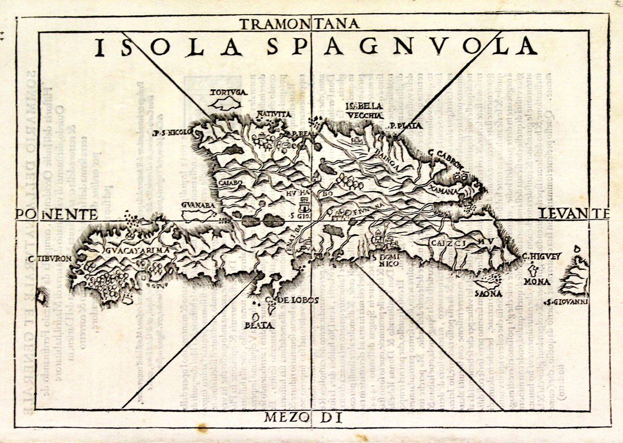 Silografia, mm 190x272. Prima edizione, rara. <BR>Tratta da "Delle navigationi et viaggi" poderoso lavoro considerato uno dei fondamenti degli studi geografici moderni, redatto dal diplomatico, geografo e umanista trevigiano Giovan Battista Ramusio (1485-1557); le notizie storico-geografiche, risultano magnificate da una precisa e dotta scrittura, che sarà riconosciuta ufficialmente, come nuovo genere letterario dell'epoca "la letteratura di viaggio". Narra dei più importanti viaggi compiuti dall'antichità classica fino al suo tempo. L'opera fu pubblicata in tre volumi, di cui il primo edito nel 1550, il terzo nel 1556 e il secondo nel 1559 (a due anni dalla morte dell'autore). I volumi della raccolta furono ristampati più volte fino al 1613 con l'aggiunta di altre relazioni di viaggio. Questa carta è tratta dal volume terzo, dedicato in gran parte alle scoperte nel Nuovo Mondo. Ottimo stato di conservazione.<BR>Woodcut, mm 190x272. Published in third volume of Ramusio's "Delle Navigationi et Viaggi". A very attractive map of Santo Domingo. Very good condition. <BR>