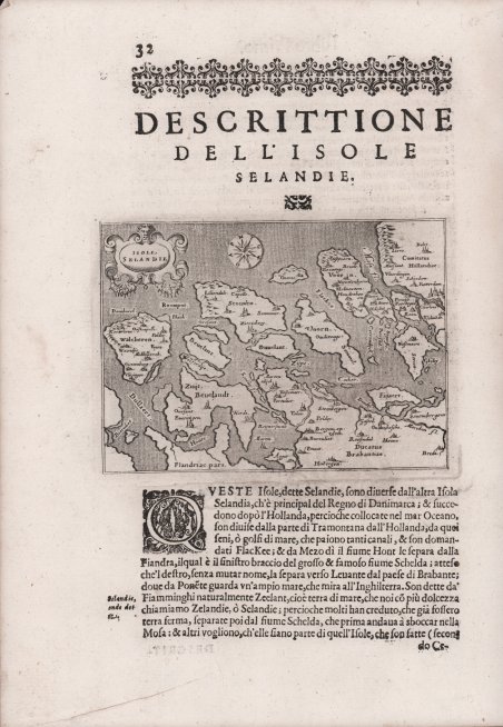 Carta geografica della Selandia, per la prima volta pubblicata nel volume “L’isole Piu Famose Del Mondo Descritte Da Thomaso Porcacchi Da Castiglione Aretino E Intagliate Da Girolamo Porro Padovan” di Tommaso Porcacchi (ca. 1532-1576), umanista e letterato originario di Castiglion Fiorentino.Gli interessi geografici coltivati sin dal Pomponio Mela del 1557 diedero vita nel 1572 al trattato, pubblicato dalla società tra il libraio Simone Galignani e l’incisore padovano Girolamo Porro, che si servirono della tipografia di Giorgio Angelieri (con privilegio di 10 anni concesso il 16 luglio 1572). Secondo Valerio (cfr. Valerio-Spagnolo, Sicilia 1477-1861, La Collezione Spagnolo-Patermo in quattro secoli di Cartografia, 2014, p. 163) il volume sarebbe stampato nell’officina di Domenico e Giovan Battista Guerra. Il volume, in formato in quarto, con dedica di Galignani a don Giovanni d’Austria, presenta le magnifiche tavole calcografiche di Porro (una seconda edizione, cospicuamente accresciuta di testo e tavole, usci nel 1576, poi ancora, postume, nel 1590, 1604, 1605, 1620 e 1686). Nella lettera dedicatoria Porro narra di essere stato il promotore dell’operazione e di aver incaricato Porcacchi di scrivere un libro sulle isole, riservandosene l’illustrazione. Il modello e quello degli “isolari”, sul quale però Porcacchi innesta lo spirito delle corografie antiche, aggiungendo per ciascuna isola una descrizione fisica, storica e culturale. La concezione e molto ampia (sono comprese penisole, grandi isole come l’Inghilterra o interi continenti: l’America Settentrionale), ma nel “Prohemio” Porcacchi fornisce un glossario di termini geografici che testimonia lo sforzo di impiegare in maniera corretta la terminologia della disciplina (cfr. Franco Pignatti, Porcacchi Tommaso, in "Dizionario Biografico degli Italiani" - Volume 85, 2016). Nel testo vi sono mappe di isole incise su mezza pagina, compreso il planisfero – riduzione della carta murale di Camocio del 1567 e la “carta da navigare con le rotte e i venti, di derivazione gastaldina. Incisione in rame posta nella parte superiore del foglio che contiene anche la parte descrittiva, in ottimo stato di conservazione. Map taken form “L’isole Piu Famose Del Mondo Descritte Da Thomaso Porcacchi Da Castiglione Aretino E Intagliate Da Girolamo Porro Padovan” by Tommaso Porcacchi (ca. 1532-1576), humanist and scholar from Castiglion Fiorentino. The geographical interests cultivated since Pomponio Mela in 1557 gave life to the treatise published in 1572 by the company between the bookseller Simone Galignani and the Paduan engraver Girolamo Porro, who used the typography of Giorgio Angelieri (with the privilege of 10 years July 1572). The volume, with a dedication by Galignani to Don Giovanni d'Austria, presents the magnificent calcographic plates by Porro (a second edition, conspicuously augmented with text and tables, came out in 1576, then again, posthumously, in 1590, 1604, 1605, 1620 and 1686). In the dedicatory letter Porro tells of having been the promoter of the operation and of having entrusted Porcacchi with writing a book on the islands, reserving the illustration. The model is that of the "isolari", on which however Porcacchi inserts the spirit of ancient chorographies, adding a physical, historical and cultural description for each island. The concept is very broad (including peninsulas, large islands such as England or entire continents: North America), but in the "Prohemio" Porcacchi provides a glossary of geographical terms that testifies to the effort to correctly use the terminology of the discipline (see Franco Pignatti, Porcacchi Tommaso, in "Dizionario Biografico degli Italiani" - Volume 85, 2016). In the text there are maps of islands engraved on half a page, including the planisphere - reduction of the wall map of Camocio of 1567 and the "carta marina”.Copperplate placed at the top of the sheet also including a descriptive part, in very good condition. Cfr.