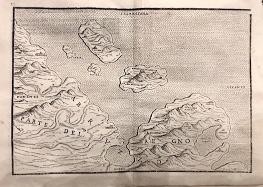 Xilografia originale (cm. 25x17,5 più ampi margini bianchi) tratta dall’opera ‘Isole appartenenti alla Italia’. Minima traccia di piega editoriale, peraltro esemplare in ottimo stato di conservazione. Rara.