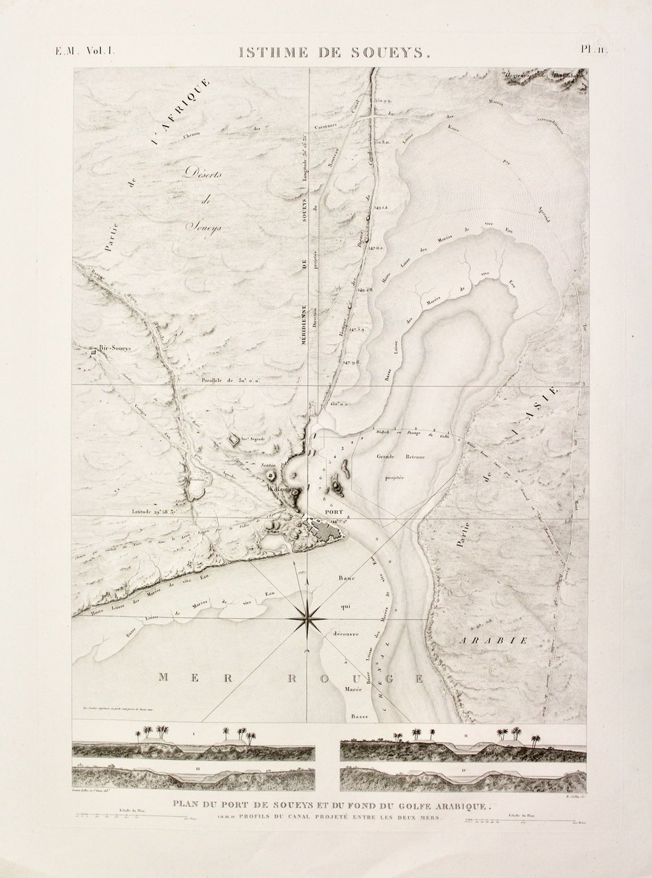 Copper engraving, mm 610x450 (platemark), signed "Gratien lePere et St. Denis del.t" and "E. Collin sc.t". Very good condition. A beautiful engraved map of the Port of Suez and environs, with small profiles of "the planned canal between the two seas." This very large, finely engraved image is plate 11 from Volume I of the Modern State section of the monumental publication "Description de L'Egypte," which documented the research of the "savants" who accompanied Napoleon Bonaparte's ambitious expedition to Egypt (1798-1801). The European demand for information about Egypt and its glorious monuments led to the publication of two editions of the work, with engravings pulled from the same printing plates; this is from the second edition, uncolored as issued.