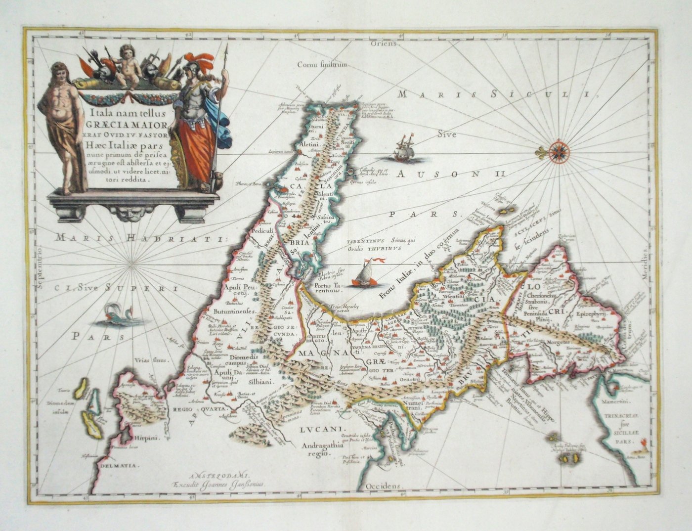 Incisione in rame, mm 385x515, colorata a mano. Piacevole carta della Magna Grecia, nella non comune edizione senza testo del 1652, arricchita da un bel cartiglio in alto. Tratta da “Accurata Orbis antiqui Delineatio” l’atlante storico, curato da Hornius ed inserito da Janssonius come volume VI del suo “Atlas Novus”. La carta è una copia di quella originariamente edita da Ortelio nel “Parergon” del "Theatrum Orbis Terrarum". Janssonius, genero di Jodocus Hondius e cognato di Henricus, collaborò alla pubblicazione di atlanti, dopo l’acquisizione delle lastre di Mercatore da parte di Jodocus e dal 1638 fu in effetti colui che guidò l’impresa editoriale, mentre Henricus Hondius lentamente abbandonava l’attività (dal 1646 il suo nome non apparirà più su alcun frontespizio); risultò così divenire il grande avversario della famiglia Blaeu nel secolo d’oro della cartografia olandese. Perfetto esemplare marginosissimo con una quasi invisibile vecchia traccia di piega all’angolo inf. destro.