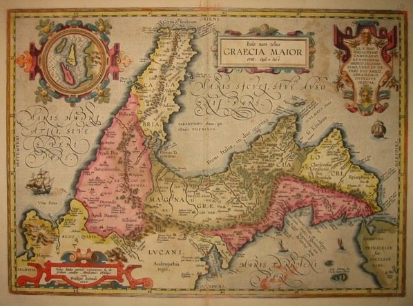 Incisione originale su rame (cm. 47,7x34,5 più ampi margini) tratta dal ‘Theatrum Orbis Terrarum’. Splendida coloritura coeva all’acquarello. Minima traccia di piegatura centrale ma ottimo esemplare. Provenienza: Biblioteca del Castello di Cirey. Van den Broecke, 210.