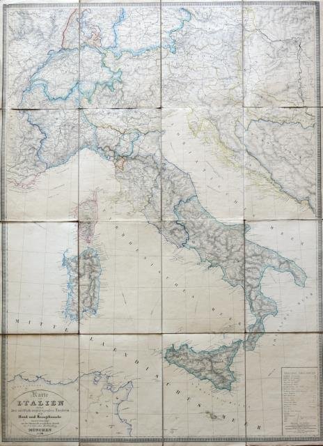 München, 1839. Carta telata incisa su acciaio con confini in colore d’epoca, cm 58,5 x 80,5, divisa in 16 riquadri, titolo in ovale nell'angolo in basso a sinistra, legenda grafica in riquadro nell'angolo in basso a destra. Esemplare in piacevole e tenue coloritura, buono stato di conservazione.