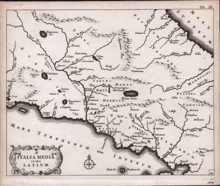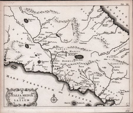 Carta dettagliata dell'Italia centrale, da Titi Livii Historiarum quod exstat di Livio / cum integris Joannis Freinshemii supplementis emendatioribus & suis locis collocatis, tabulis geographicis & copioso indice ; recensuit et notulis auxit Joannes Clericus. Amsterdam 1710 circa. Jan Goeree (1670-1731) disegnatore, incisore, poeta e autore; nacque a Middleburg ma lavorò principalmente ad Amsterdam, dove morì anche. Figlio di Willem Goeree e allievo di Gerard de Lairesse ad Amsterdam; nel 1715 disegnò i dipinti del soffitto del municipio di Amsterdam (dipinti da Hoogzaat e Rademaker). Principalmente attivo come disegnatore e incisore di frontespizi. Incisione in rame, ottimo stato di conservazione. Detailed map of Central Italy, from Livus' ' Titi Livii Historiarum quod exstat / cum integris Joannis Freinshemii supplementis emendatioribus & suis locis collocatis, tabulis geographicis & copioso indice ; recensuit et notulis auxit Joannes Clericus. Amsterdam 1710 circa Jan Goeree (1670-1731) draughtsman, engraver, poet and author; born in Middleburg but mainly working in Amsterdam where he also died. Son of Willem Goeree and Pupil of Gerard de Lairesse in Amsterdam; 1715 designed ceiling paintings for town-hall of Amsterdam (painted by Hoogzaat and Rademaker). Mainly active as designer and engraver of title-pages. Copperplate, fine condition. Cfr.