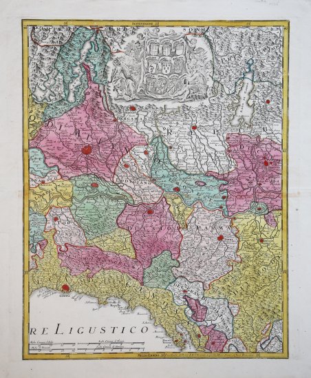 Carta geografica del nord ovest, uno dei fogli dellla grande carta del corso del Po. La carta deriva dal Seutter, dal quale il Lotter ereditò la tipografia. Tobias Conrad Lotter (1717 - 1777) fu un incisore ed editore di mappe tedesco. Lotter sposò Euphrosina Seutter (1709-1784), figlia maggiore dell’editore Matthäus Seutter. Cominciò a lavorare nell'attività cartografica del suocero verso il 1740. Tra il 1740 e il 1744 produsse, sotto la direzione di Seutter, l'Atlas minor, Praecipua orbis terrarum imperia, regna et provincias, Germania potissimum tabelli. Alla morte di Seutter (1757), gli successe suo figlio, Albrecht Karl Seutter (1722-1762). Le lastre delle mappe di Suetter furono successivamente divise tra Lotter e l'editore Johan Mitchell Probst (1727 - 1776). Con il sostegno dei suoi figli, Tobias Conrad Lotter riuscì a costruire il successo economico e la reputazione professionale del suocero. Col tempo, Lotter divenne uno dei più importanti editori di mappe della metà del XVIII secolo che lavoravano nella scuola tedesca. Acquaforte con coloritura editoriale, in ottimo stato di conservazione. Map of Northwestern of Italy, one of the sheet of the great map of course of River Po. Tobias Conrad Lotter (1717 - 1777) was a German engraver and map publisher. Lotter married Euphrosina Seutter (1709-1784), elder daughter of Matthäus Seutter. He began working at his is father-in-law's map business about 1740. Between 1740 and 1744 he produced, under Seutter's imprint, the Atlas minor, Praecipua orbis terrarum imperia, regna et provincias, Germania potissimum tabelli. Upon Seutter's death, in 1757, the firm's stock was taken over by his son, Albrecht Karl Seutter (1722-1762), who himself died in 1762, just a few years later. The remaining Suetter map plates were subsequently divided between Lotter and the publisher Johan Mitchell Probst (1727 - 1776). With the support of his sons, Matthäus Albrecht (1741-1810), Georg Friedrich (1744-1801) and Gustav Conrad (1746-1776), Tobias Conrad Lotter succeeded in building on the economic success and professional reputation of his father-in-law. In time, Lotter became one of the most prominent mid-18th century map publishers working in the German school. Copperplate with fine original colouring, good condition. Cfr.