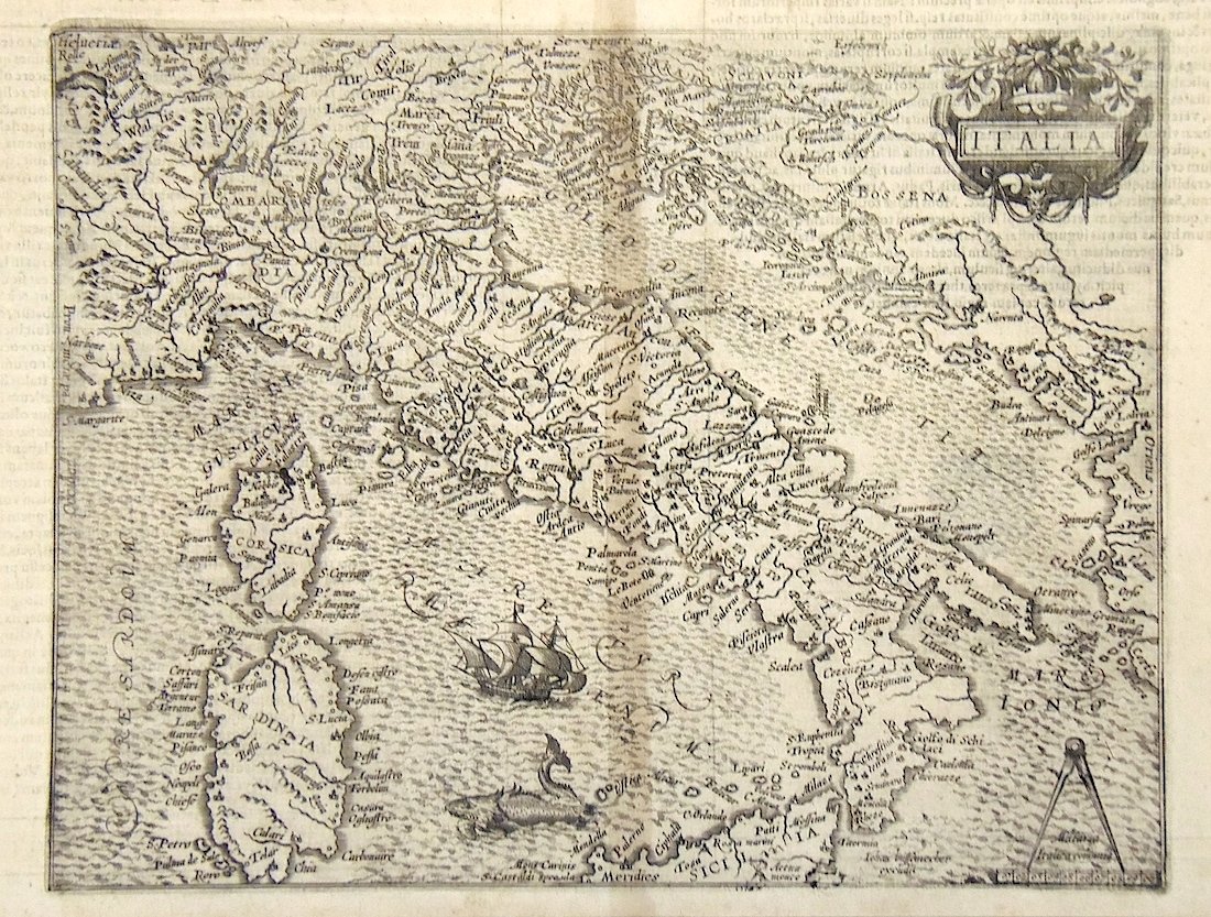 Incisione in rame, mm 210x270. <BR>Questa carta di ispirazione mercatoriana, stampata da Johannes Bussemacher, collaboratore di Quad, che firma in lastra "Iohan Bussemecher excudit" è inserita in varie opere: "Europae, totius orbis terrarum partis praestantissimae universalis et particularis descriptio" pubblicato dal 1592 al 1596, "Geographisch Handt-buch" del 1600 e "Fasciculus Geographicus" del 1608. <BR>Quad, nato in Olanda, si trasferì in Germania per sfuggire alle guerre di religione che imperversarono a fine Cinquecento diventando uno dei massimi esponenti della Scuola Cartografica di Colonia, formata principalmente da rifugiati fiamminghi ed olandesi tra i quali spicca il fondatore Frans Hogenberg. Quad usò per la sua attività diversi pseudonimi, tra cui Cyprian Eichovius e Konrad Loew. A causa dei numerosi pseudonimi la sua vasta produzione editoriale è di grande fascino e rarità. Ottimo stato di conservazione<BR>Borri, L'Italia nelle antiche carte, 83; Meurer, Atlantes Coloniensis, Qua 42, pag. 214<BR><BR>