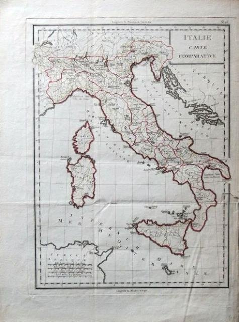 Francia, 1800 circa. Tratta da una guida con la cartografia del De L'Isle e del De Fer, incisione in rame, confini in colore d'epoca, cm 34,5 x 45,5 circa (alla lastra). Al retro del foglio il numero 115. Un piccolo strappo alla metà del margine laterale destro, buono stato di conservazione.
