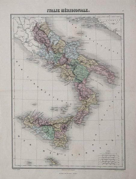 Carta tratta dalla ' Géographie universelle. Atlas-Migeon (Revu par Vuillemin) historique, scientifique, industriel et commercial à l'usage des Lycées. des Seminaires et des Familles comprenant la Géographie, L'Histoire, la Statistique, etc, Paris, J. Migeon 1872. Questo atlante francese è uno dei più decorativi della fine del XIX secolo. Oltre a essere colorate a mano, la maggior parte delle carte presenta una o più superbe vignette che illustrano città o i principali monumenti della regione. L'atlante contiene 36 carte, tra cui una carta celeste, sei carte storiche e 29 carte “moderne”. L'atlante è chiamato ' Atlas-Migeon ' dal nome del suo editore, ma l'autore della maggior parte delle carte è Louis Edouard Desbuissons (1827-1908), un prolifico cartografo che lavorò a Parigi per molti decenni presso il Ministère des Affaires Etrangères. Acquaforte con colori originali, ottimo stato di conservazione. Map taken from the ' Géographie universelle. Atlas-Migeon (Revu par Vuillemin) historique, scientifique, industriel et commercial à l'usage des Lycées. des Seminaires et des Familles comprenant la Géographie, L'Histoire, la Statistique, etc, Paris, J. Migeon 1872. This French atlas is one of the most decorative atlases of the late 19th century. In addition to being hand colored, the majority of the maps feature one or more superb vignettes showcasing key cities or monuments from the region. The atlas contains 43 maps (41 of which are double-page), including one celestial chart, six historical maps, and 37 modern maps. It is called Atlas Migeon because of the name of its publisher, but the author of the majority of the maps was Louis Edouard Desbuissons (1827-1908), a prolific mapmaker who worked in Paris for many decades in the Ministère des Affaires Etrangères. Etching with original hand colour, very good condition. Cfr.