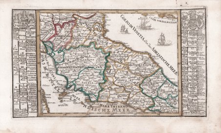 Carta preparata per l'opera Curioses Staats und Kriegs Theatrum, Dermahliger Begebenheiten in denen in Italien. pubblicata ad Augsburg nel 1700 ca e ristampata nel 1706. Esemplare nel secondo stato; nel piccolo cartiglio posto nella fascia destra in basso si è cancellato il nome dell'Autore e vi si è scritto "Gabriel Bodenher": tratto dall'opera Atlas curieux oder Neuer und Compendieuser Atlas, in welchen ausser den General Land Charten von America, Africa, Asia und Europa, und der in letzerem gelegenen Reichen und Ländern, sehr viele Speciale von besondern Provincien und Territorien, sorderlich deren, die in letzeren Kriegen renomiert worden, enthalten sind, herausgegeben und verlegt von Gabriel Bodenher, Kupfferstecher in Augspurg. Augsburg, G. Bodenher, 1715 ca. (ma diverse ristampe fino al 1740). “Con graduazione ai margini, di 10' in 10', va da 41° 10' a 44° 50' lat. e da 32° a 39° long. Ha scale in miglia italiane, miglia tedesche e in ore di viaggio. La carta è affiancata da due utili prospetti. Il primo, in alto a sinistra, dà il titolo alla carta e fa suddivisioni geografiche dell'area rap- presentata, dal territorio mantovano al Golfo di Gaeta, ripartendole poi per appartenenza politica (vedi le tre partizioni dello Stato della Chiesa in Sud-Centro-Nord con le corrispettive aree che le compongono: Umbria, Perugino, Città di Castello e Marca di Ancona). Nel prospetto sulla destra, sormontato dagli stemmi del Granducato di Toscana, dello Stato Pontificio e della Repubblica di Lucca, si precisano i centri maggiori componenti detti territori (ad es., per la voce Umbria si indicano Spoleto, Terni e Narni). Per quanto attiene alla carta, di dimensioni assai ridotte, è da rilevare la troppo modesta cura per l'idronomastica - neanche il F. Tevere merita il nome! -, mentre soddisfacente è il numero dei centri abitati riportati, peraltro con pochissime storpiature. Una certa commistione linguistico-toponimica (in tedesco e in italiano) caratterizza le scritture maggiori che indicano l'assetto politico-amministrativo nonché i nomi di aree subregionali” (cfr. "Le antiche terre del Ducato di Spoleto", p. 118). Acquaforte, coloritura coeva dei contorni, in ottimo stato di conservazione. ' Carta preparata per l'opera ' Curioses Staats und Kriegs Theatrum, Dermahliger Begebenheiten in denen in Italien. ' pubblicata ad Augsburg nel 1700 ca e ristampata nel 1706. Esemplare nel secondo stato; nel piccolo cartiglio posto nella fascia destra in basso si è cancellato il nome dell'Autore e vi si è scritto "Gabriel Bodenher": tratto dall'opera ' Atlas curieux oder Neuer und Compendieuser Atlas, in welchen ausser den General Land Charten von America, Africa, Asia und Europa, und der in letzerem gelegenen Reichen und Ländern, sehr viele Speciale von besondern Provincien und Territorien, sorderlich deren, die in letzeren Kriegen renomiert worden, enthalten sind, herausgegeben und verlegt von Gabriel Bodenher, Kupfferstecher in Augspurg. ' Augsburg, G. Bodenher, 1715 ca. (ma diverse ristampe fino al 1740). “Con graduazione ai margini, di 10' in 10', va da 41° 10' a 44° 50' lat. e da 32° a 39° long. Ha scale in miglia italiane, miglia tedesche e in ore di viaggio. La carta è affiancata da due utili prospetti. Il primo, in alto a sinistra, dà il titolo alla carta e fa suddivisioni geografiche dell'area rap- presentata, dal territorio mantovano al Golfo di Gaeta, ripartendole poi per appartenenza politica (vedi le tre partizioni dello Stato della Chiesa in Sud-Centro-Nord con le corrispettive aree che le compongono: Umbria, Perugino, Città di Castello e Marca di Ancona). Nel prospetto sulla destra, sormontato dagli stemmi del Granducato di Toscana, dello Stato Pontificio e della Repubblica di Lucca, si precisano i centri maggiori componenti detti territori (ad es., per la voce Umbria si indicano Spoleto, Terni e Narni). Per quanto attiene alla carta, di dimensioni assai ridotte, è da rilevare la troppo modesta cura per l'idronomastica - neanche il F. Tevere merita il nome! -, mentre soddisfacente è il numero dei centri abitati riportati, peraltro con pochissime storpiature. Una certa commistione linguistico-toponimica (in tedesco e in italiano) caratterizza le scritture maggiori che indicano l'assetto politico-amministrativo nonché i nomi di aree subregionali” (cfr. "Le antiche terre del Ducato di Spoleto", p. 118). Acquaforte, coloritura coeva dei contorni, in ottimo stato di conservazione. Cfr. F. Ronca e A. Sorbini (a cura di) "Le antiche terre del Ducato di Spoleto", p. 118, n. 45.