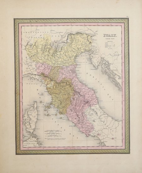 Ottimo esemplare della carta del 1849 di S. A. Mitchell della parte settentrionale dell'Italia. Centrata sulla Toscana, questa carta si estende dalla Lombardia allo Stato Pontificio (compresa Roma) e alla Repubblica di Venezia. Le caratteristiche politiche e topografiche sono annotate e codificate a colori. L'insieme è inciso e colorato nello stile caratteristico di Mitchell, con bordi verdi e pastelli vivaci. Mitchell pubblicò questa carta nel suo atlante dal 1846 alla fine degli anni Cinquanta del XIX secolo, prima di interrompere la serie e vendere le sue lastre a De Silver. Questa carta è stata pubblicata nell'edizione del 1849 del New Universal Atlas. Fu l'ultima edizione di quell'atlante pubblicata da Mitchell prima di vendere le lastre e i diritti dell'atlante a Thomas Cowperthwait nel 1850. Samuel Augustus Mitchell (20 marzo 1792 - 20 dicembre 1868) iniziò la sua carriera di editore di mappe all'inizio degli anni Trenta del XIX secolo. Mitchell nacque a Bristol, nel Connecticut. Si trasferì a Filadelfia nel 1821. Avendo lavorato come insegnante di scuola e scrittore di geografia, Mitchell era frustrato dalla bassa qualità e dall'imprecisione dei testi scolastici dell'epoca. Le sue prime mappe furono un tentativo di correggere questo problema. Nei 20 anni successivi Mitchell sarebbe diventato il più importante editore americano di mappe della metà del XIX secolo. Mitchell collaborò con gli importanti incisori J. H. Young, H. S. Tanner e H. N. Burroughs prima di ottenere il copyright completo sulle sue mappe nel 1847. Nel 1849 Mitchell si associò o vendette le sue lastre a Thomas, Cowperthwait and Company che continuò a pubblicare l'Atlante di Mitchell. Intorno al 1856 la maggior parte delle lastre e dei diritti d'autore di Mitchell furono acquisiti da Charles Desilver, che continuò a pubblicare le mappe, molte delle quali con bordi e schemi di colore modificati, fino a quando entrò in scena il figlio di Mitchell, Samuel Augustus Mitchell Junior. Nel 1859, S.A. Mitchell Junior riacquistò la maggior parte delle tavole da Desilver e introdusse il proprio bordo a motivi floreali. A partire dal 1860 pubblicò le proprie edizioni del New General Atlas. Il giovane Mitchell divenne importante quanto il padre, pubblicando mappe e atlanti fino al 1887, quando la maggior parte dei diritti d'autore fu nuovamente venduta e la ditta Mitchell chiuse i battenti per l'ultima volta. Ottimo esemplare della carta del 1849 di S. A. Mitchell della parte settentrionale dell'Italia. Centrata sulla Toscana, questa carta si estende dalla Lombardia allo Stato Pontificio (compresa Roma) e alla Repubblica di Venezia. Le caratteristiche politiche e topografiche sono annotate e codificate a colori. L'insieme è inciso e colorato nello stile caratteristico di Mitchell, con bordi verdi e pastelli vivaci. Mitchell pubblicò questa carta nel suo atlante dal 1846 alla fine degli anni Cinquanta del XIX secolo, prima di interrompere la serie e vendere le sue lastre a De Silver. Questa carta è stata pubblicata nell'edizione del 1849 del New Universal Atlas. Fu l'ultima edizione di quell'atlante pubblicata da Mitchell prima di vendere le lastre e i diritti dell'atlante a Thomas Cowperthwait nel 1850. Samuel Augustus Mitchell (20 marzo 1792 - 20 dicembre 1868) iniziò la sua carriera di editore di mappe all'inizio degli anni Trenta del XIX secolo. Mitchell nacque a Bristol, nel Connecticut. Si trasferì a Filadelfia nel 1821. Avendo lavorato come insegnante di scuola e scrittore di geografia, Mitchell era frustrato dalla bassa qualità e dall'imprecisione dei testi scolastici dell'epoca. Le sue prime mappe furono un tentativo di correggere questo problema. Nei 20 anni successivi Mitchell sarebbe diventato il più importante editore americano di mappe della metà del XIX secolo. Mitchell collaborò con gli importanti incisori J. H. Young, H. S. Tanner e H. N. Burroughs prima di ottenere il copyright completo sulle sue mappe nel 1847. Nel 1849 Mitchell si associò o vendette le sue lastre a Thomas, Cowperthwait and Company che continuò a pubblicare l'Atlante di Mitchell. Intorno al 1856 la maggior parte delle lastre e dei diritti d'autore di Mitchell furono acquisiti da Charles Desilver, che continuò a pubblicare le mappe, molte delle quali con bordi e schemi di colore modificati, fino a quando entrò in scena il figlio di Mitchell, Samuel Augustus Mitchell Junior. Nel 1859, S.A. Mitchell Junior riacquistò la maggior parte delle tavole da Desilver e introdusse il proprio bordo a motivi floreali. A partire dal 1860 pubblicò le proprie edizioni del New General Atlas. Il giovane Mitchell divenne importante quanto il padre, pubblicando mappe e atlanti fino al 1887, quando la maggior parte dei diritti d'autore fu nuovamente venduta e la ditta Mitchell chiuse i battenti per l'ultima volta. Cfr.
