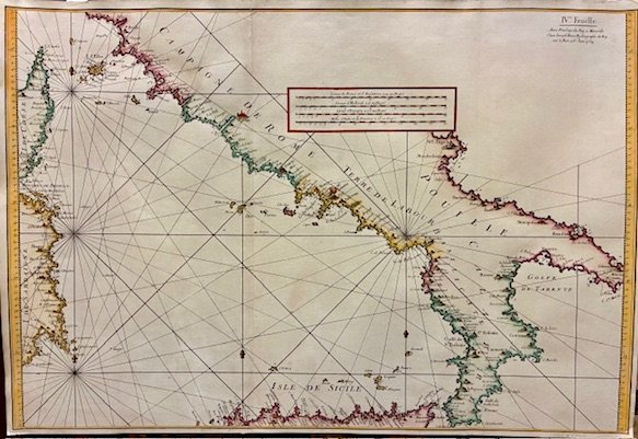 Carta geografica originale (cm. 81,5x55 più margini bianchi) tratta da ‘Carte de la Mer Mediterranée en Douze Feuilles’. Esemplare in ottimo stato di conservazione. Coloritura all’acquarello. Non comune. Dettagliata ed affascinante carta nautica che raffigura l’intero bacino del Mar Tirreno.